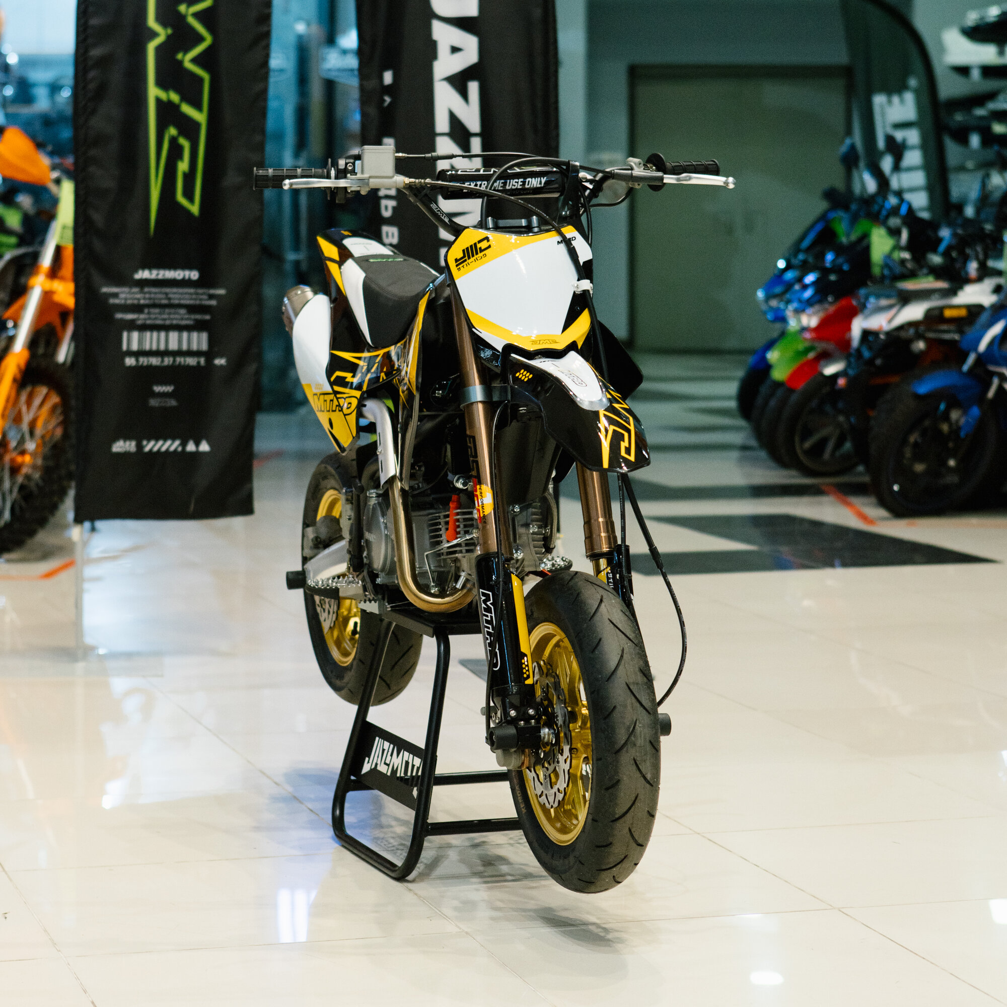 JMC 160 MOTARD PRO V3.0 — усовершенствованная версия популярной модели для минимотарда, созданная как профессиональный спортивный питбайк с акцентом на доступность и высокие динамические характеристики. Питбайк построен на пространственной стальной раме, которая сочетает небольшой вес и высокую жесткость благодаря современным технологиям производства. Модель оснащена двухдисковой передней тормозной системой и новыми литыми колесными дисками, обеспечивающими снижение веса без потери прочности. Подвеска включает переднюю вилку FASTACE с регулировками отбоя и сжатия и задний амортизатор DNM с полным набором регулировок, что позволяет точно настроить поведение байка под стиль езды и условия трассы. За работу байка отвечает оригинальный двигатель YX 1P60FMK 160 см³ с масляным охлаждением. Карбюратор NIBBI PE24 обеспечивает стабильную подготовку топливной смеси. В конструкции применены качественные комплектующие: алюминиевый маятник, кованные траверсы, нержавеющий выпускной коллектор, элементы управления и защиты из легированной стали. JMC 160 MOTARD PRO V3.0 12/12 подходит для тренировок и соревнований по минимотарду и отличается надежностью, точной управляемостью и современной конфигурацией узлов. Быстрая курьерская доставка по Москве и Московской области. Отправка в регионы России транспортными компании.