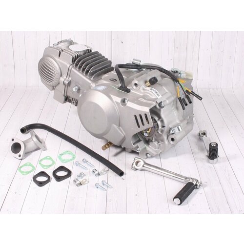 Комплектация: - двигатель - ведущая звезда 15Т 428 - впускной коллетор - термокольцо для коллектора и карбюратора - прокладки для коллектора и карбюратора - болты для установки карбюратора - крышка генератора - лапка кикстартера - лапка переключения передач
