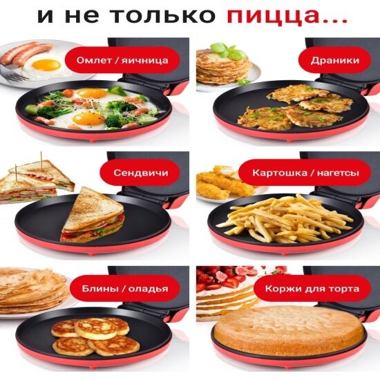 Это современный многофункциональный прибор с изящным дизайном, отличный выбор для тех, кто хочет сэкономить время и при этом получить вкусную еду. В считанные минуты приготовить вкуснейшую пиццу, и не только, но и всё что жарится на сковороде: котлеты, стейки, яичницу, омлет, различные пироги, сырники, горячие бутерброды и запеканки. Также можно готовить, запечённые овощи, мясо, рыбу и коржи для торта и многое другое.