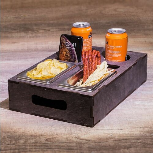 Пивной столик (пивной поднос, пивница, столик-поднос) - удобнейшая вещь, чтобы поставить бокалы пива или банки и закуски, когда нет стола. Можно удобно разместить его рядом при просмотре матча или фильма и не волноваться, что что-то упадет или разольется. Наши столики разработаны так, что нижняя сторона не может выпасть под весом продуктов. С боков есть две удобные ручки для переноски. Данная модель рассчитана на 2 бутылки или 2 бокала, 2 контейнера для закусок, телефон, отверстие под салфетки. Контейнер не идет в наборе. Размер столика длина 38см, ширина 26см, высота 10 см.