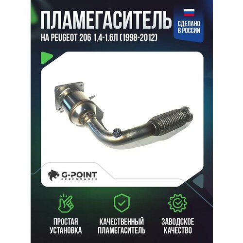 Пламегаситель на Пежо 206 1,4-1.6л (двиг. TU5JP4B_EC5) (1998-2012) от G-Point – достойная замена заводскому катализатору. Эта деталь – полноценный стальной коллектор с качественным огнеупорным пламегасителем внутри. Если нужна замена катализатора на Peugeot 206, вам пригодится обманка. Её мы дарим каждому клиенту при заказе пламегасителя. Пламегаситель для Пежо 206 нашего производства – аналог заводского катализатора. Он произведён на современном, технологичном производстве с учётом особенностей выхлопной системы данной модели авто. При установке не нужно колхозить, деталь устанавливается без сварки «болт-он». Если на табло появилась ошибка «Check Engine, установка пламегасителя от G-Point поможет от неё избавиться. Вы получите качественную деталь по цене ниже стоимости заводского катколлектора. Простой монтаж обойдётся гораздо дешевле сварочных работ. Преимущества пламегасителя для Peugeot 206 от G-Point: - Нержавеющая сталь и огнеупорная набивка внутри - Совместимость с креплениями автомобиля – 100% - Самая выгодная цена на рынке - Монтаж в любом сервисном центре или самостоятельная установка - Гарантия до 2 лет - Товар от производителя Не уверены, что эта деталь подойдёт именно вашему автомобилю? Пришлите свой VIN-номер для проверки совместимости. Артикул: GP-42505 Эта модель пламегасителя также подходит для: - Citroen C3 1,4-1.6л (двиг. TU5JP4B_EC5) (2002-2009) - Citroen C4 1,4-1.6л (двиг. TU5JP4B_EC5) (2004-2014) - Peugeot 206 1,4-1.6л (двиг. TU5JP4B_EC5) (1998-2012) - Peugeot 207 1,4-1.6л (двиг. TU5JP4B_EC5) (2006-2015) - Peugeot 307 1,4-1.6л (двиг. TU5JP4B_EC5) (2001-2008)