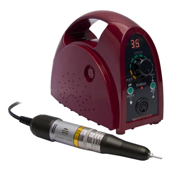 Planet Nails Машинка для маникюра и педикюра 35000 об/мин. Аппараты Orbita предназначены для профессионального выполнения маникюра/педикюра и наращивания ногтей. Благодаря их применению повышается скорость, безопасность и аккуратность проведения процедуры. Данная технология особенно рекомендована тем, у кого быстро растёт кутикула и обнаружены проблемы с ногтями. В отличие от традиционной технологии, предусматривающей распаривание кожи в теплой воде, при выполнении аппаратного маникюра достаточно выбрать крем для размягчения. Также ещё одно преимущество применения аппаратов Orbita и других - полное исключение травмирования в виде порезов и т. д. Придать желаемую форму ногтевой пластины помогают специальные сменные насадки. Для удаления мозолей во время выполнения маникюра предназначены низкообразивные насадки, вращающиеся на больших оборотах. Аппаратный педикюр помогает размягчить огрубевшую кожу, удалить кутикулы и натоптыши, отполировать ногти. Аппараты Orbita удаляют лишь огрубевший слой, не затрагивая здоровые кожные покровы. Вес: 2200 г. Вес ручки: 215 г. Длина ручки: 130 мм. Мощность: 65 Вт. Педаль: Да. Плавная регулировка скорости вращения фрезы: Да. Реверс: Да. Тип питания: 220 В. Фрезы в комплекте. Цанговый зажим: Да. Частота вращения: 35 000 оборотов в минуту