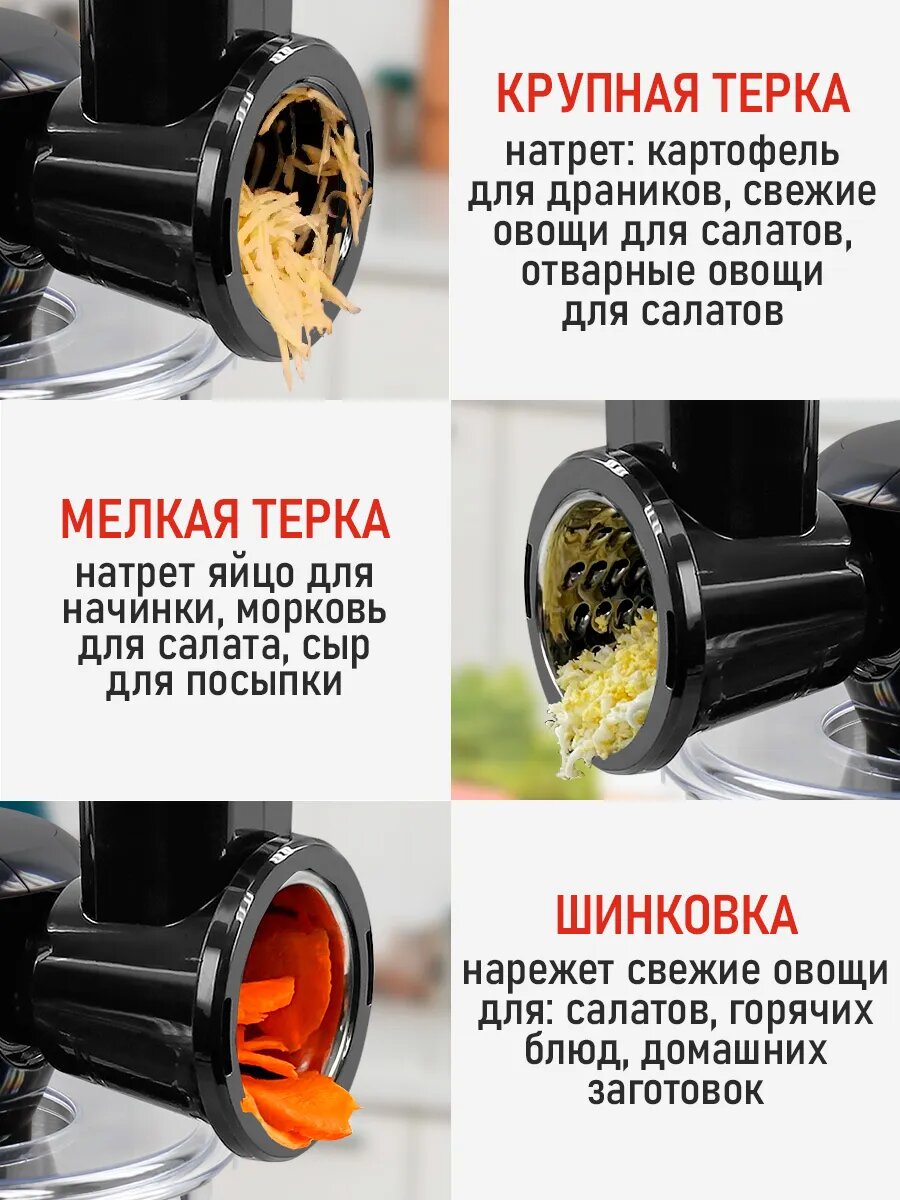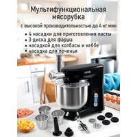 Мясорубка с 3 дисками из нержавеющей стали с отверстиями разного диаметра и насадками для формования домашних колбасок и восточных кеббе, а также насадкой для приготовления фигурного печенья.