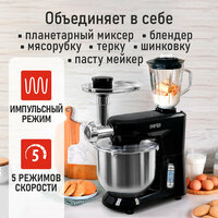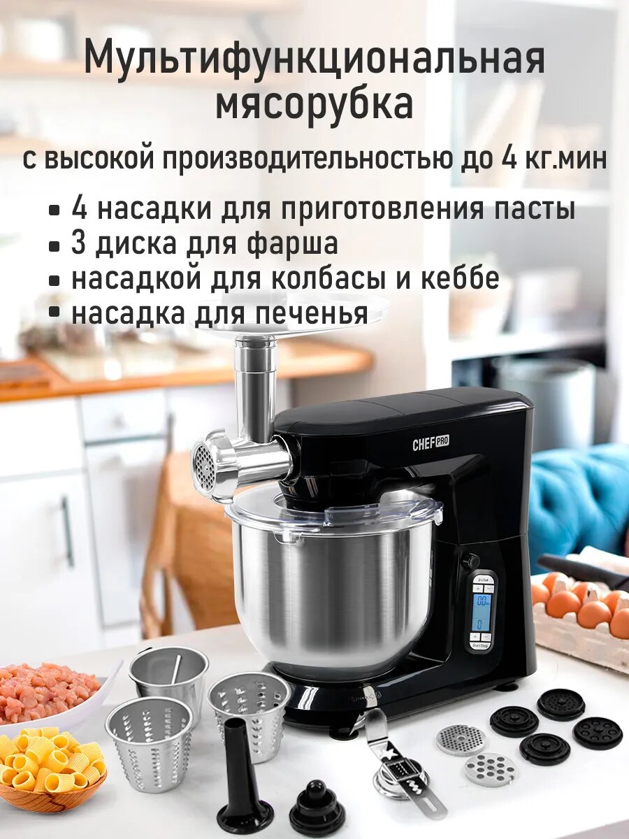 Кухонная машина "17 в 1" от Chef Pro - это многофункциональный кухонный помощник, который совмещает в себе возможности планетарного миксера, мясорубки, стационарного блендера и овощерезки.