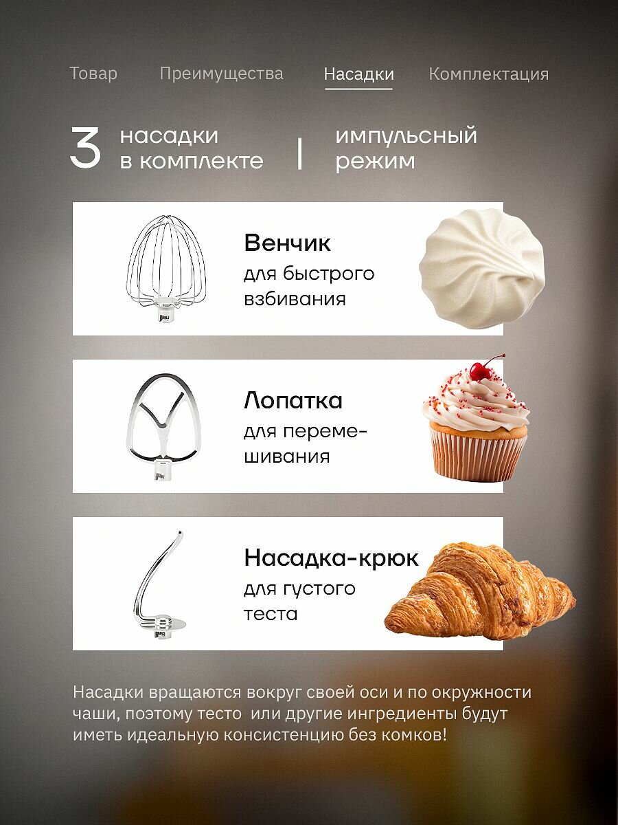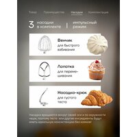 | Насадки | венчик для взбивания, крючки для замешивания теста, лопатка |