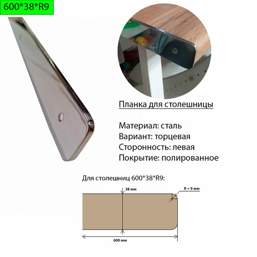 Торцевая планка для столешницы предназначена для установки на торцевой срез столешницы (с левой стороны). Сделана из нержавеющей стали - прочна и долговечна. Защищает срез от попадания влаги. Для столешниц: Шириной - 600 мм Толщиной - 38 мм Радиусом завала (закругления на торце) - 9 мм (R9)