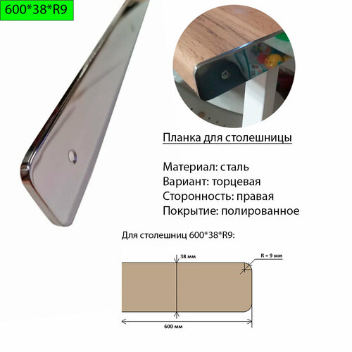 Торцевая планка для столешницы предназначена для установки на торцевой срез столешницы (с правой стороны). Сделана из нержавеющей стали - прочна и долговечна. Защищает срез от попадания влаги. Для столешниц: Шириной - 600 мм Толщиной - 38 мм Радиусом завала (закругления на торце) - 9 мм (R9)