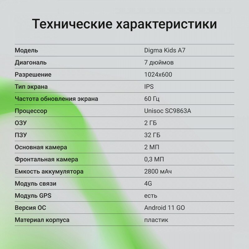 | Особенности | FM-тюнер, cлот для карты памяти, акселерометр, встроенный микрофон, детский планшет, компас, разъем для микрофона |