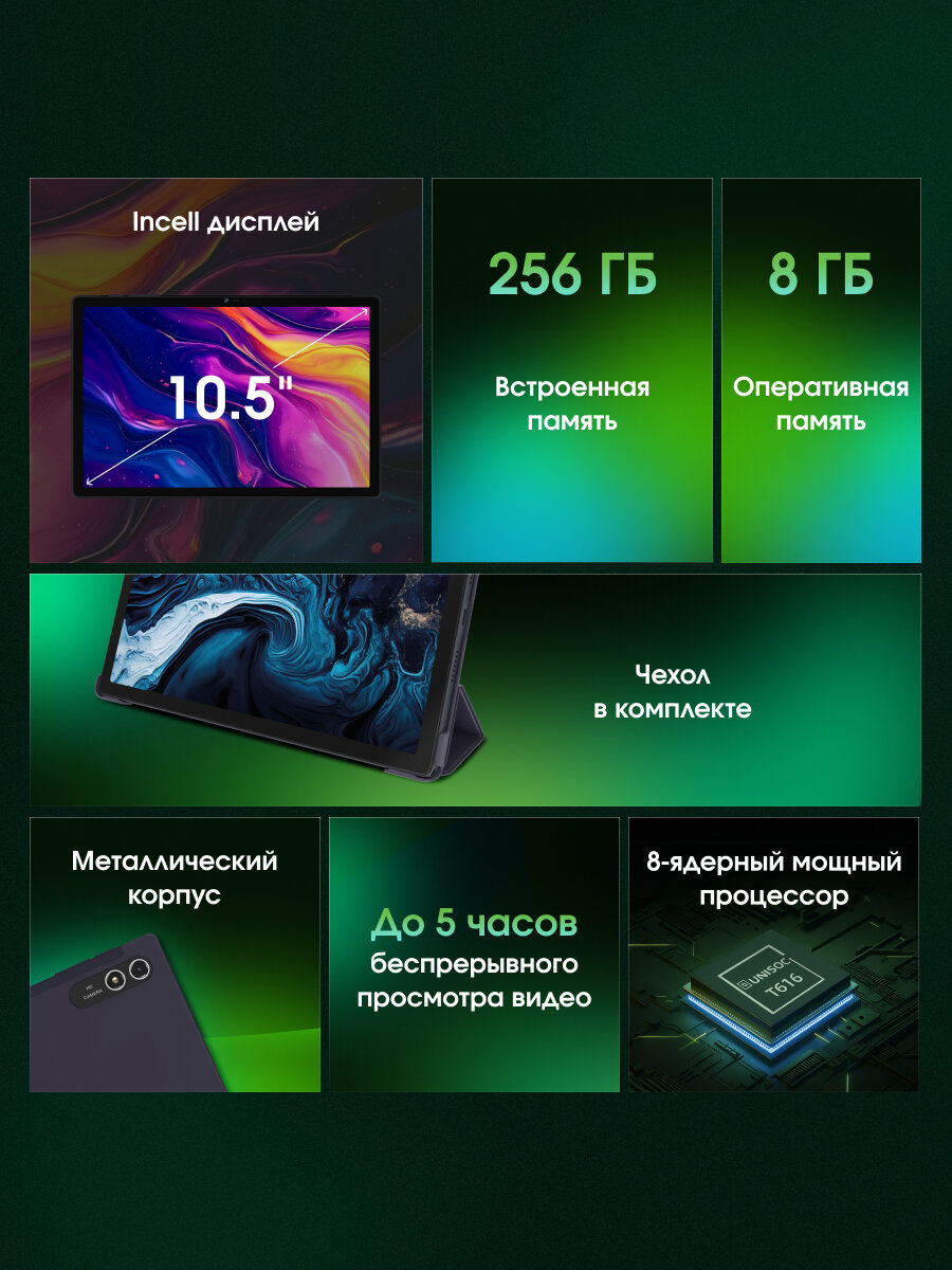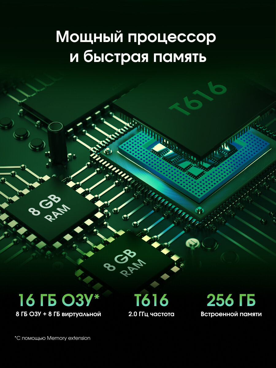 Оцените технические преимущества производительного восьмиядерного процессора Unisoc T616 в сочетании с 8 ГБ оперативной памяти: исключительно плавное воспроизведение изображения и пролистывание страниц. Держите под рукой все фото, видео, фильмы и другой контент – на вместительном накопителе объёмом 128 ГБ хватит места для всего, что вы любите. А благодаря комплектации модулем, сертифицированным для подключения к беспроводным сетям стандарта Wi-Fi 5, вы получите высокую скорость сетевого подключения и полностью избавитесь от задержек отображения в мобильных играх.
