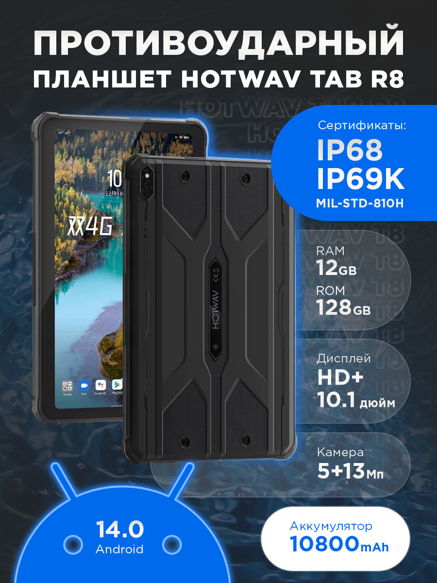 Купить Планшет противоударный Hotwav Tab R8 4+8/128 ГБ Android 14, Black (черный) с доставкой по всей России.