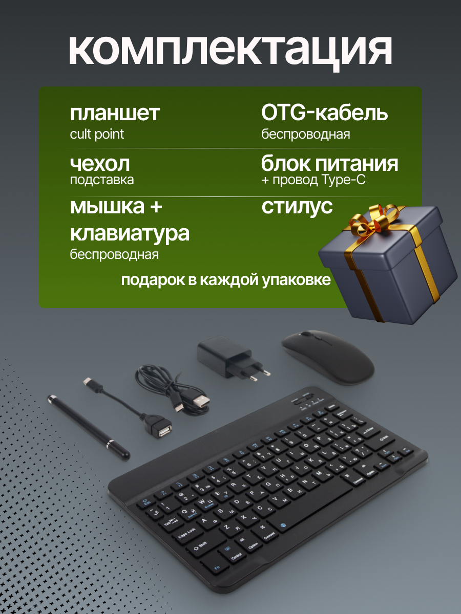 | Комплектация | зарядка 5V/2A, Type-C кабель, защитная пленка, стилус, OTG-кабель, руководство пользователя, коробка, клавиатура, беспроводная мышь, чехол |
