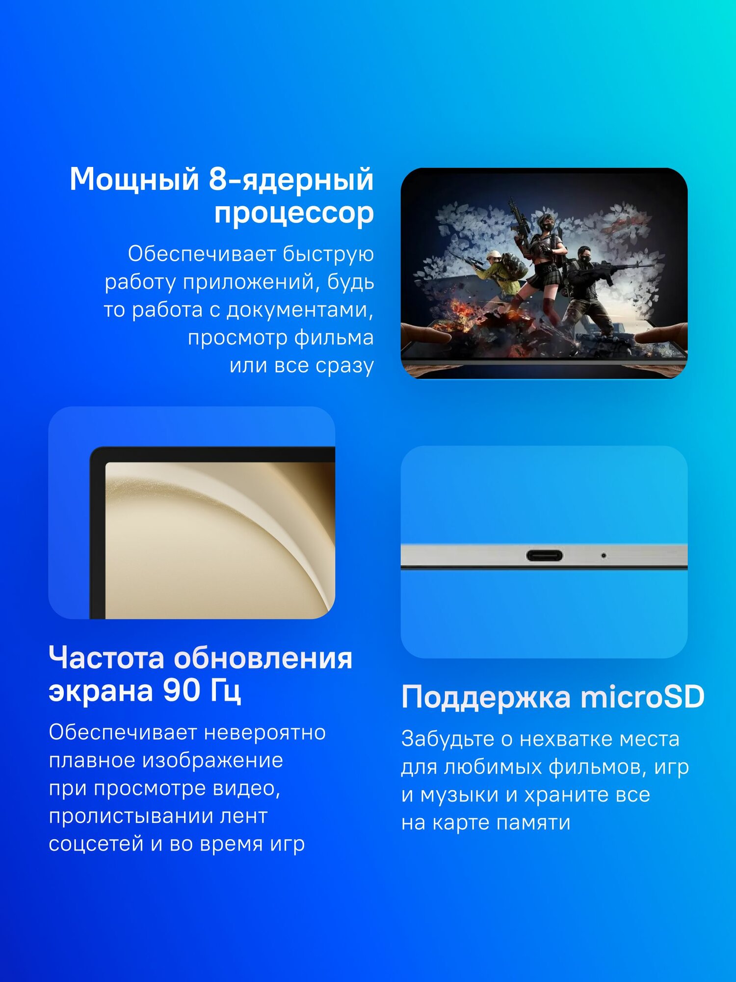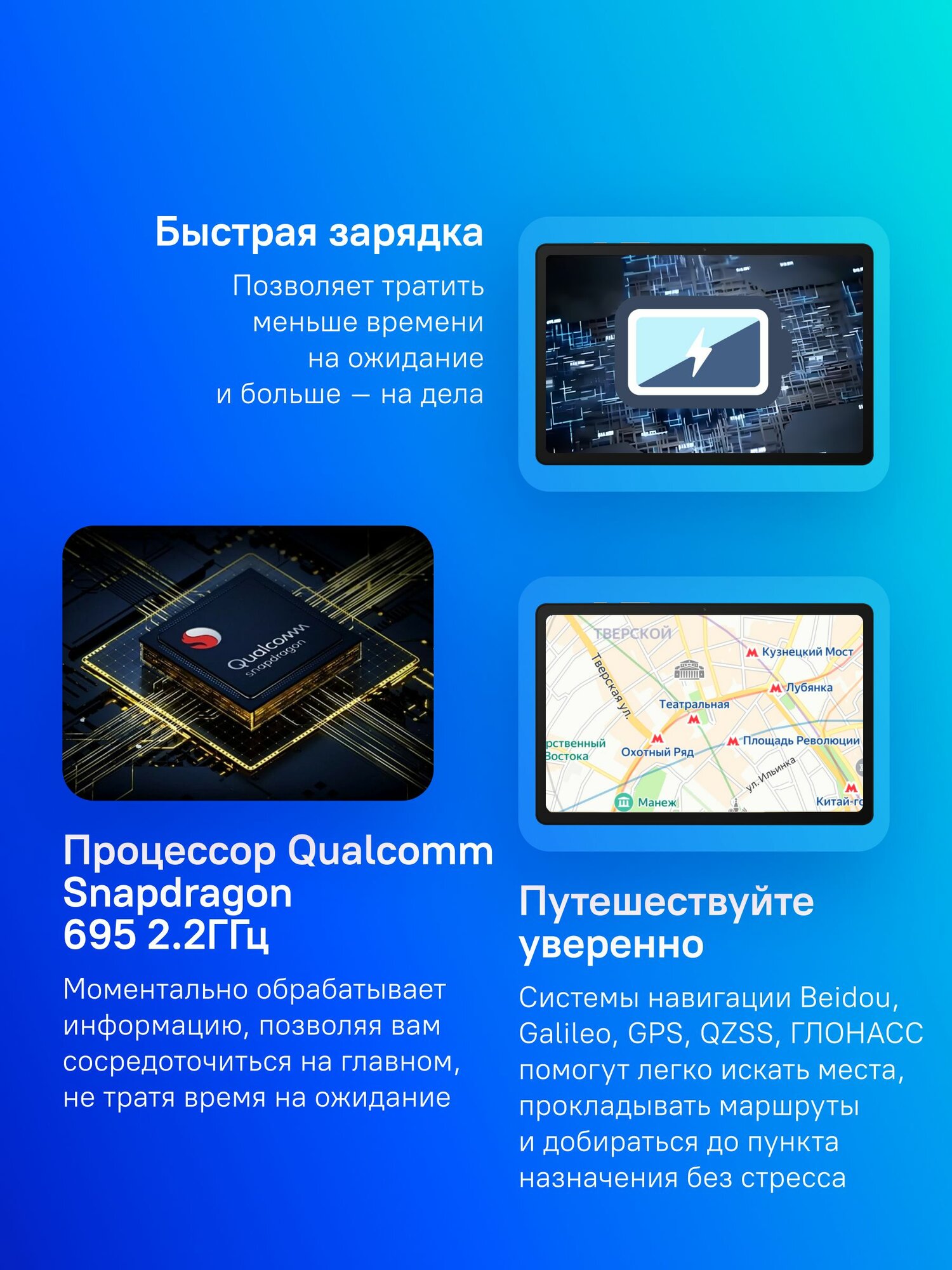 Общая информацияДата выхода на рынок2023 г. Информация? Стильный и при этом современный планшет Galaxy Tab A9+ имеет безупречный дизайн и гладкий металлический корпус. Планшет узнаваемой конструкции Samsung представлен в графитовом, серебряном и синем цветах, каждый из которых выгодно подчеркивает достоинства модели. ? Выполняйте несколько задач параллельно. На планшете Galaxy Tab A9+ вы можете, например, чертить архитектурные планы, при этом смотреть интересные мультимедиа и общаться в видеочате — запускать до трех приложений на одном экране, не закрывая окна. ? Ваши данные в полной безопасности. Храните важные данные в защищенной папке и контролируйте общую безопасность устройства на Панели конфиденциальности. Наслаждайтесь вашим устройством Samsung Galaxy, не беспокоясь об угрозах безопасности. ? Новая серия Galaxy Tab A также обеспечивает безопасность и сохранность данных, благодаря Samsung Knox – многоуровневой платформе безопасности Samsung, отмеченной множеством наград. Панель «Безопасность и конфиденциальность» позволяет пользователям легко видеть и контролировать, что происходит с их данными. С помощью функции Private Share содержимое шифруется перед отправкой. Отправитель может установить разрешения на доступ, срок действия и т. д, чтобы быть спокойным за конфиденциальность информации. А благодаря функции Secure Wi-Fi пользователи могут брать Galaxy Tab A9+ с собой в поездки, не беспокоясь о рисках пользования сетями общего доступа. Интернет-трафик шифруется, а приложения для отслеживания блокируются, что обеспечивает конфиденциальность и безопасность просмотра веб-страниц. ? Адаптер питания не входит в комплект поставки. Описание ОсновныеНазначениепотребительскийОперационная системаAndroidВерсия операционной системыAndroid 13 (OneUI 5.1)Диагональ экрана11"Разрешение экрана1920x1200Матрица экранаTFTЧастота обновления экрана90 ГцОперативная память4 ГБВнутренняя память64 ГБКоличество точек матрицы8 МпМаксимальное разрешение видео1920x1080 (30 к/с)Быстрая зарядкаДа (15 Вт)Беспроводная зарядкаНетПоддержка карт памятиДа microSD, microSDHC, microSDXCМаксимальная емкость карты памяти1 ТБВозможности подключенияWi-Fi + сотовая связьПоддержка нескольких SIM-картНет ПроцессорПлатформаQualcomm SnapdragonПроцессорQualcomm Snapdragon 695Суммарное количество ядер8Тактовая частота2 200 МГцМикроархитектура ЦПУKryo 660 Cortex-A78 2200 МГц + Kryo 660 Cortex-A55 1700 МГцРазрядность64 битаТехпроцесс6 нмГрафический ускорительДа Qualcomm Adreno 619 КонструкцияМатериал корпусаметаллЦвет корпусатемно-серыйЗащищенный корпусНет Размеры и весДлина168.7 ммШирина257.1 ммТолщина6.9 ммВес491 г ЭкранКоличество цветов экрана16 млнРазрешающая способность экрана206 ppiСоотношение сторон16:10 Основная камераВстроенная камераДаКоличество основных камер1Встроенная вспышкаНетАвтоматическая фокусировкаДаОптическая стабилизацияНет Фронтальная камераКоличество точек матрицыДа 5 МпАвтоматическая фокусировкаНетОптическая стабилизацияНетВстроенная вспышкаНетМаксимальное разрешение видео1920x1080 (Full HD) ФункцииСканер отпечатков пальцевНетРазблокировка по лицуДаВстроенный микрофонДаВстроенные динамики4 динамикаДополнительновибрация, акселерометр, датчик приближения, датчик освещенности навигацияgpsдаглонассда Передача данныхСотовая связьДа 5GСтандарты связиEDGE, HSPA, HSPA+, LTE, 5GПоддерживаемые частоты и полосы2G GSM GSM850, GSM900, DCS1800, PCS1900 3G UMTS B1(2100), B2(1900), B4(AWS), B5(850), B8(900) 4G FDD LTE B1(21