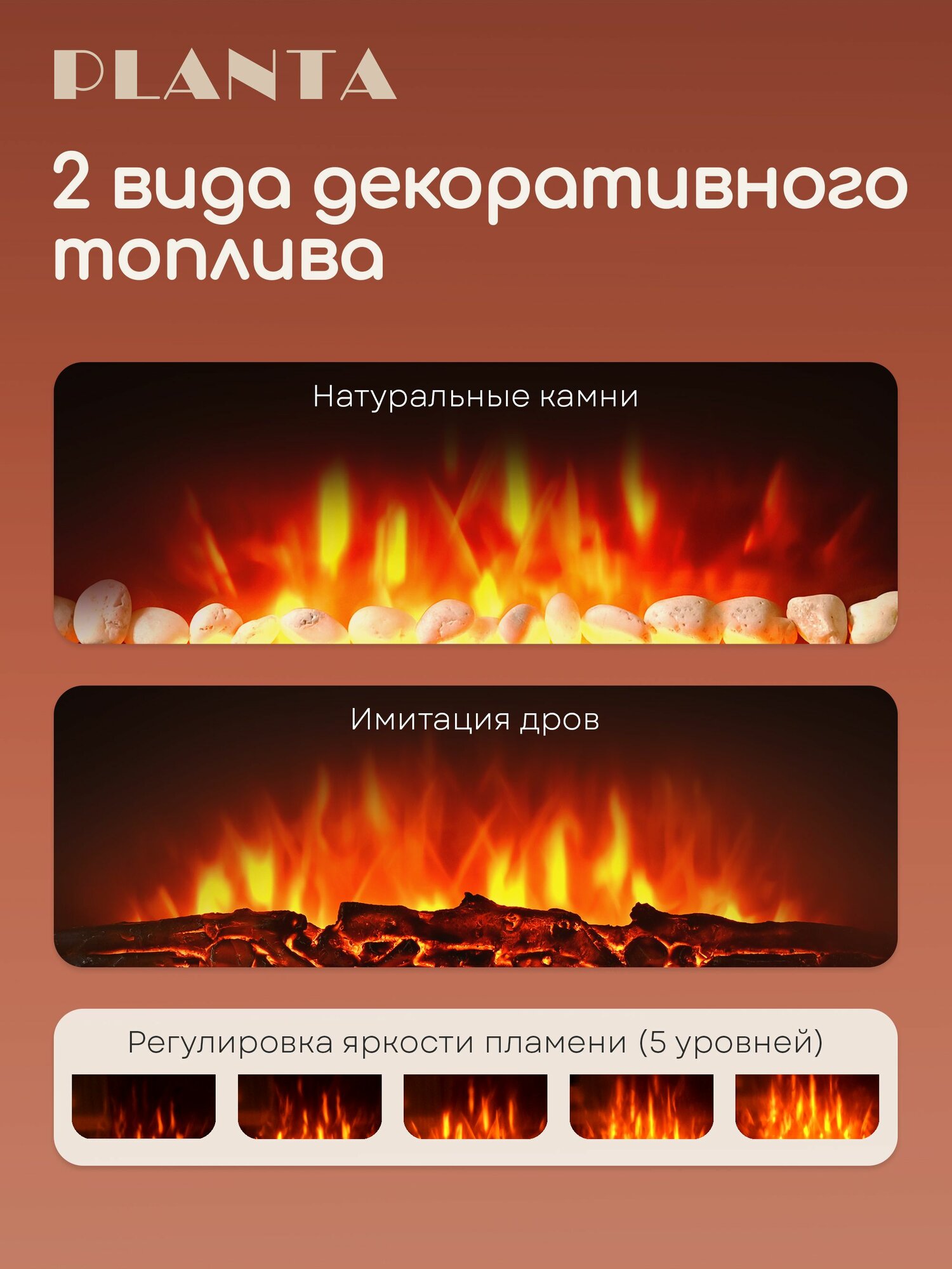 | Дополнительная информация | 2 вида декоративного топлива - белые камни и имитация дров, функция «Звук потрескивания дров», режим имитации пламени без обогрева |