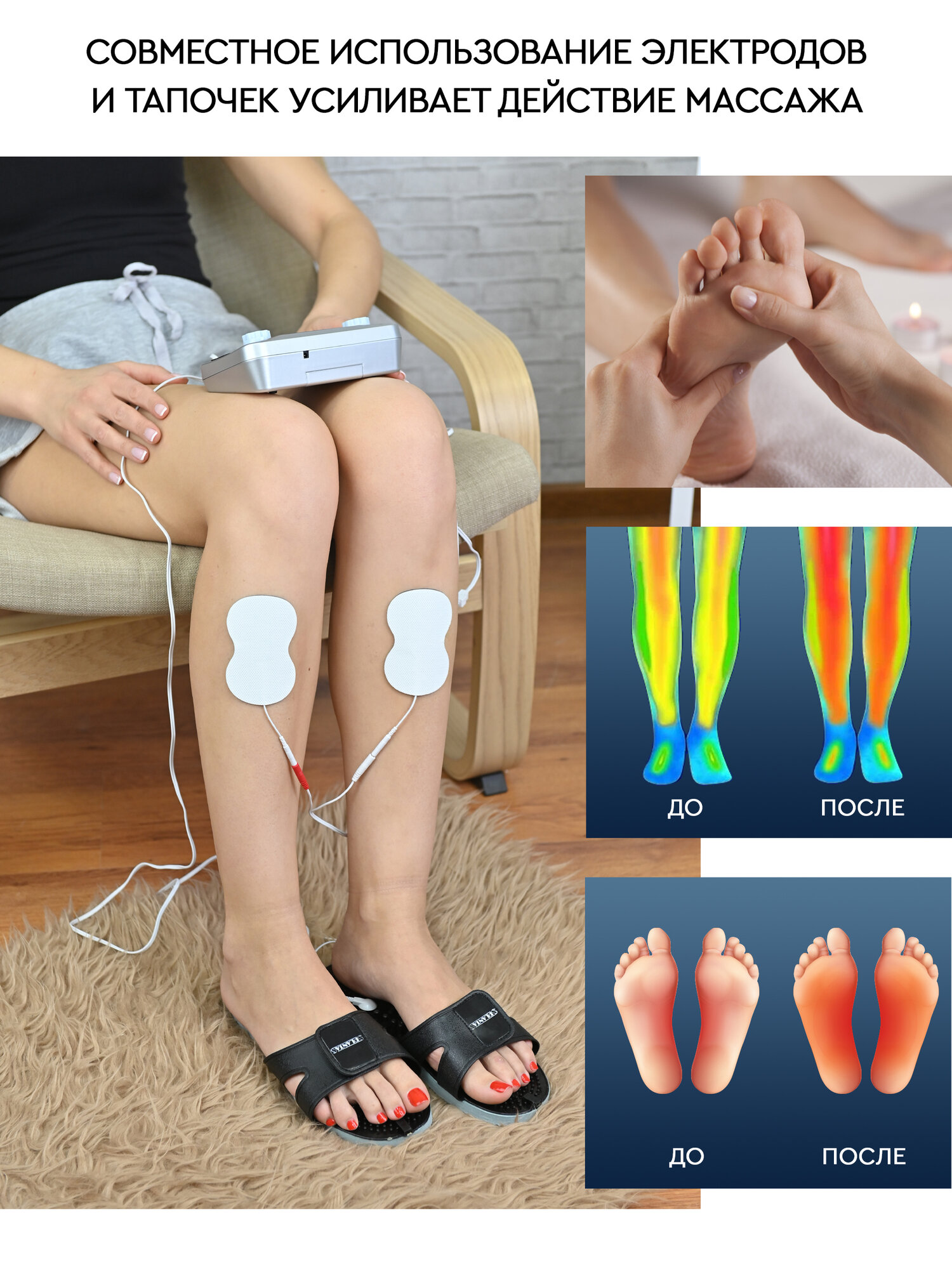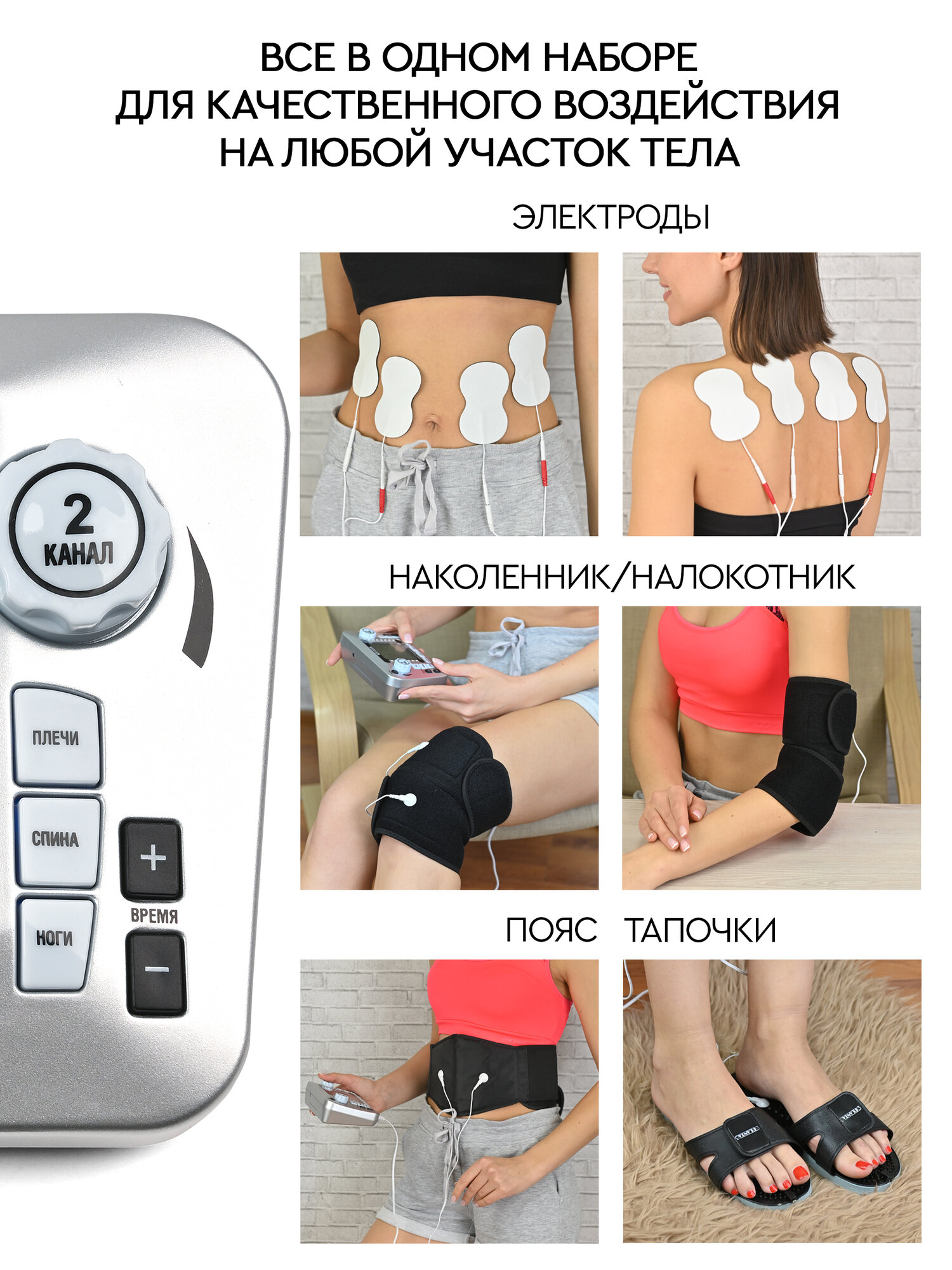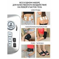 Массажер-миостимулятор 10 гель-кремниевых электродов (эллипс форма) 2 провода на 4 электрода 2 провода для аксессуаров Пояс Пара тапочек Наколенник/налокотник Адаптер питания