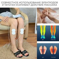 Через тапочки с электродами оказывается активное воздействие на область стопы и икр. Такой массаж стимулирует кровообращение, помогает снять тяжесть и усталость, обладает лимфодренажным эффектом.