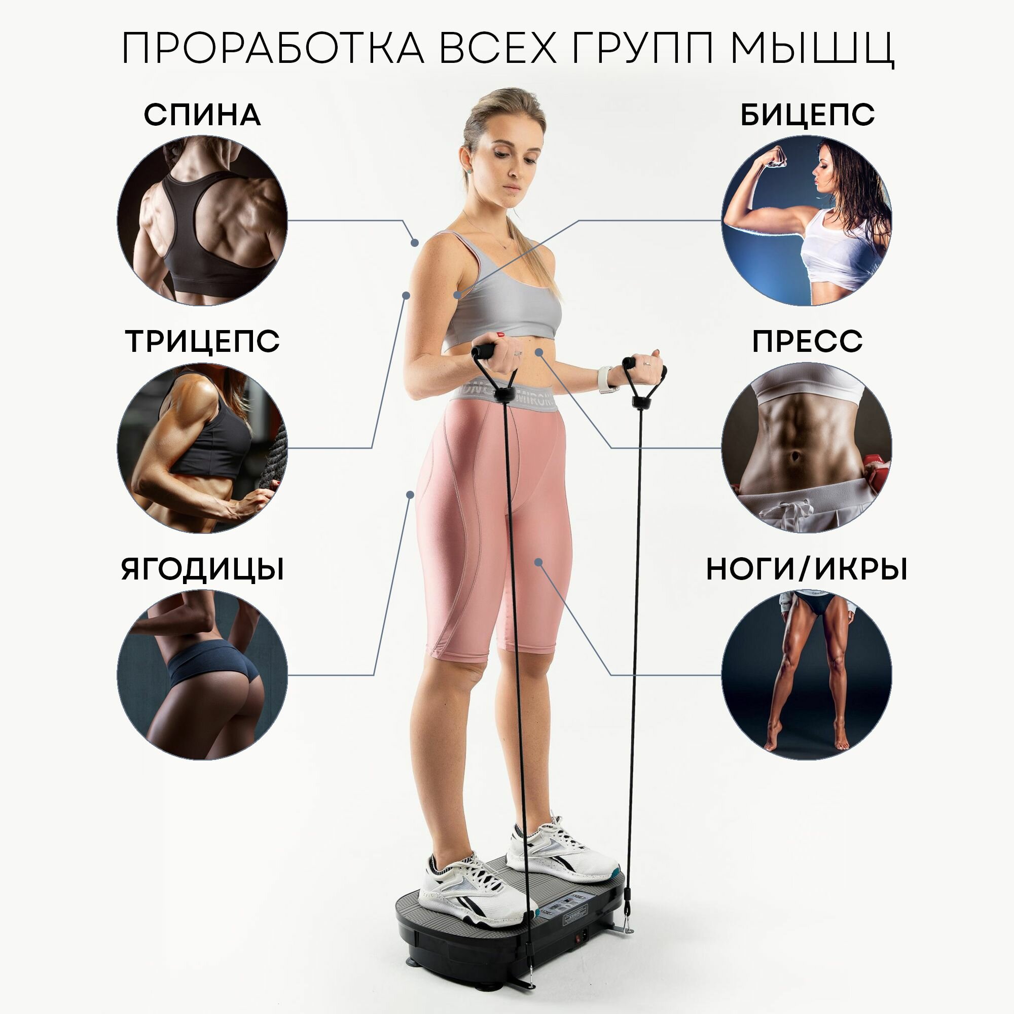 | Особенности | дисплей, программы тренировок, пульт ДУ, регулировка частоты вибрации, ручное управление, таймер, эспандеры |