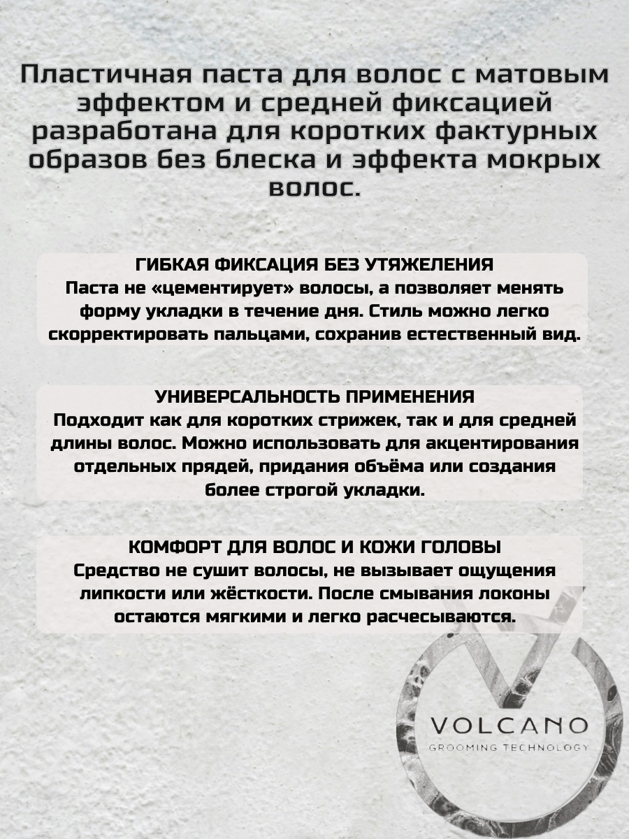✅ Гибкая фиксация без утяжеления: Паста не «цементирует» волосы, а позволяет менять форму укладки в течение дня. Стиль можно легко скорректировать пальцами, сохранив естественный вид.