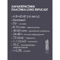 Replicast Long отличается низкой температурой полимеризации и слабым запахом ароматических углеводов, что делает его безопасным и удобным в использовании. Он обладает более длительным времени жизни - 8 минут, а время извлечения из формы — 40-60 минут, полное отверждение происходит за 24-48 часов. Эти параметры позволяют эффективно планировать рабочий процесс.