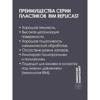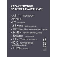 · Не имеет резких специфических запахов Время жизни составляет 2-3 минуты, а время извлечения из формы — 15-30 минут. Полное отверждение происходит за 24-48 часов, что позволяет эффективно планировать рабочий процесс. Продукт обладает хорошей окрашиваемостью, что позволяет создавать изделия с гладкой и однородной поверхностью, что важно для декоративных изделий и прототипов. Технические параметры RIM Replicast: - Твердость по Шору Д: 50 - Плотность, г/см3 - 1,15 - Температура тепловой деформации, С -80 - Усадка, % - 0,2 - Цвет: черный - Вес набора: 2 кг
