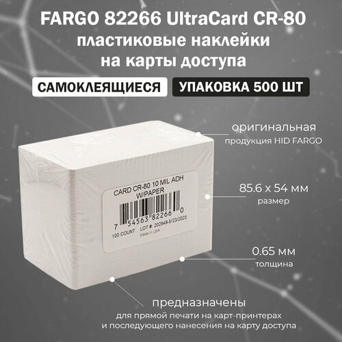 Предназначены для наклеивания на пластиковые карты доступа HID, EM-Marine, Mifare, Indala и пр. Пластиковая наклейка Fargo UltraCard 82266 представляет собой двухслойную пластиковую заготовку/карту размером 85.6 х 54 мм, верхний слой которой изготовлен из пластика PVC, а нижний является картонной отрывной подложкой.