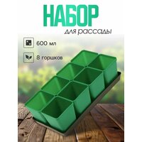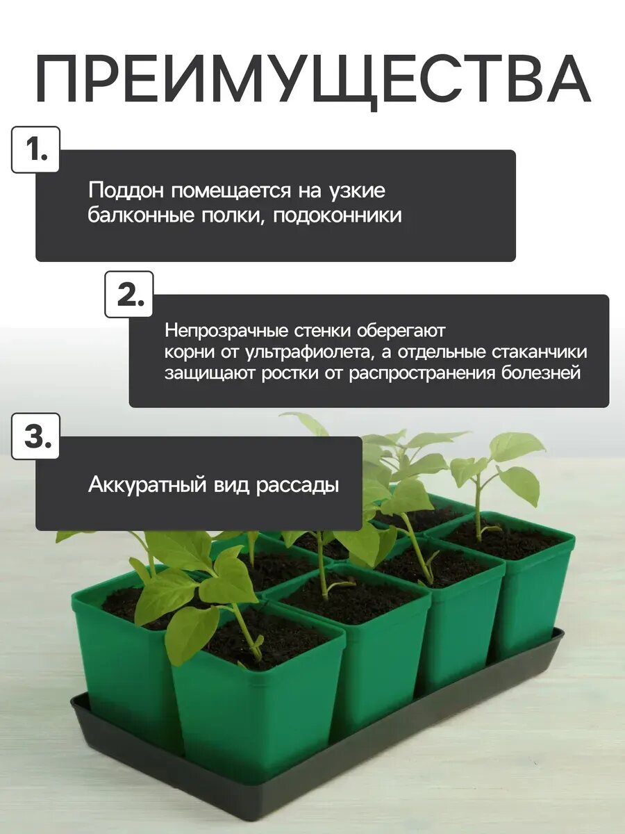Набор для рассады содержит стаканы по 600 мл (8 шт.) и поддон 42х17 см. Обратите внимание! Выбор конкретных цветов данной модели не предоставляется производителем, к сожалению, в карточке товара могут быть представлены не все возможные цвета. Стаканы, горшки для рассады, для цветов - незаменимый аксессуар дома и дачи. Пластиковый набор для рассады выполнен из высококачественного пластика. Это не одноразовые стаканы и не бумажные. Это набор горшки для цветов состоит из 8-ми индивидуальных горшочков для рассады и общим поддоном. Каждый Кашпо снизу оборудован дренажными отверстиями, что обеспечивает циркуляцию влаги и предотвращение загнивания корней. Набор для выращивания растений выполнен из прочного и долговечного материала, срок службы набора более 5 лет. Кашпо для цветов не деформируются при пересадке и обеспечивают защиту молодому растению в период его прорастания и пересадки. Ящик для рассады вы сможете использовать повторно. Квадратные стаканы под рассаду имеют подвижное дно. Благодаря этому, Вы сможете вынуть растение, не повредив корни. Кассета для рассады подойдёт для выращивания рассады помидоров, огурцов, капусты и тд. При выращивании в общем ящике корни часто переплетаются и получают недостаточно питания и кислорода. Рассадник на 8 стаканчиков создаёт правильные условия. Размер тары подходит для свободного развития корневой системы большинства растений. Стаканчики расположены в два ряда, поэтому рассада в каждом из них получает одинаковое количество света. Изделие легко моется, сохраняет форму на солнце, не гниёт, не ломается при падении. Рассадник обладает повышенной плотностью и влагостойкостью. Поддон придаёт стаканчикам устойчивость, экономит место, облегчает транспортировку. Преимущества: поддон шириной 18 см помещается на узкие балконные полки, подоконники. Непрозрачные стенки оберегают корни от ультрафиолета. Поддон помогает регулировать увлажнённость почвы. Отдельные стаканчики защищают ростки от распространения болезней.