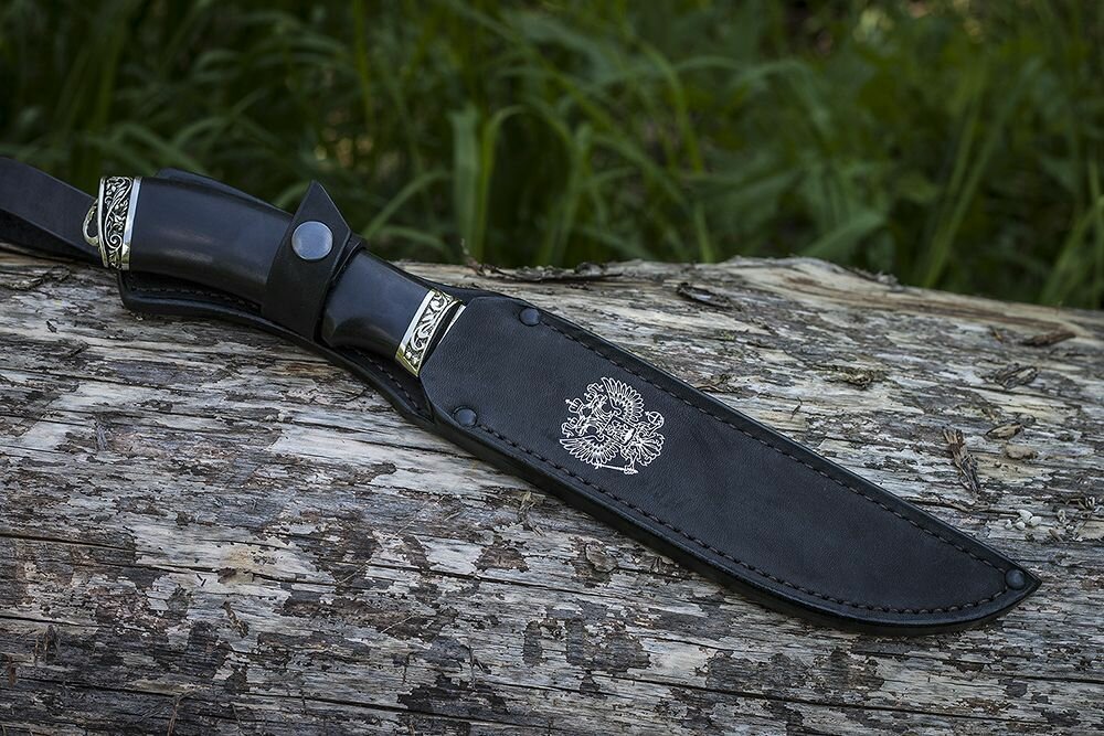 Нож укомплектован индивидуальными ножнами, что обеспечивает безопасное хранение и транспортировку. В комплекте также идет сертификат государственного образца, подтверждающий соответствие ножа всем требованиям ГОСТ Р 51644-2000 "Ножи разделочные и шкуросъемные. Общие технические условия".