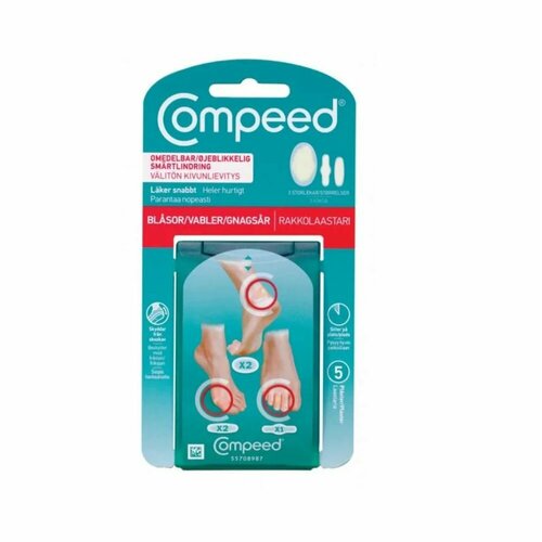 Пластырь "Compeed" mix от влажных мозолей на ногах предназначен для быстрого заживления мозоли. Мгновенно уменьшает боль. содержит блистерные пластыри Compeed трех размеров и идеально подходит, например, для поездки на самолете или в поездке. Утонченный по краям блистерный пластырь Compeed хорошо держится на месте, защищает кожу от воды, грязи и бактерий, но позволяет коже дышать. Водостойкий пластырь ускоряет заживление Абсорбирует раневую жидкость, образуя гелевый слой, который защищает мозоль от трения и внешнего давления. Держится на месте несколько дней, не отклеиваясь при контакте с водой. Количество пластырей в упаковке : 5шт разного размера .
