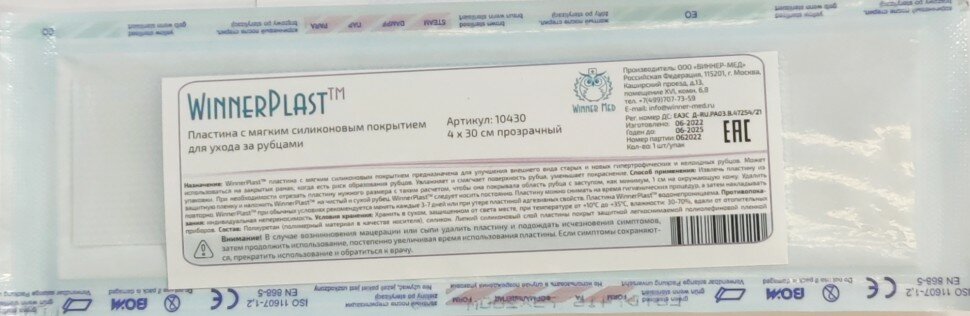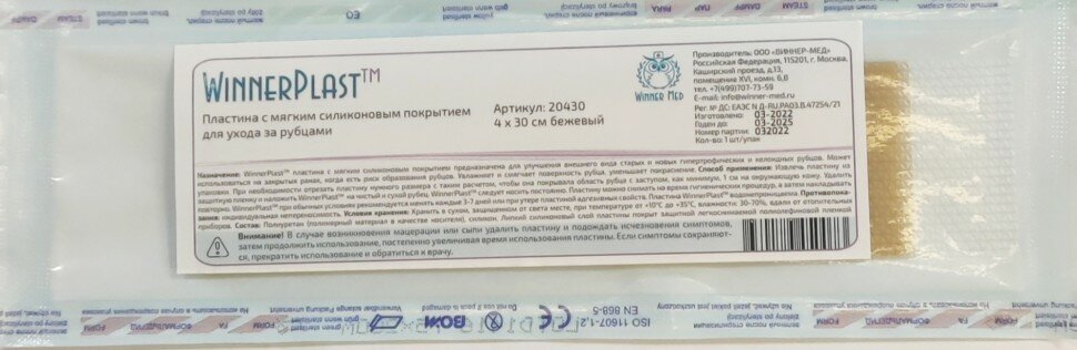 WinnerPlast - пластина с мягким силиконовым покрытием для ухода за рубцами и закрытыми ранами. Она улучшает внешний вид рубцовой ткани, увлажняет и смягчает, уменьшает покраснение в проблемной зоне.