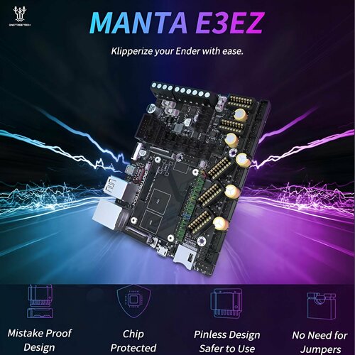 BIGTREETECH Manta E3EZ 1.0 — это плата управления для 3D-принтеров, разработанная командой Bigtreetech. Она предназначена для модернизации вашего 3D принтера (например, Ender 3), поддерживая как Klipper, так и Marlin с последними функциями. Эта материнская плата стала первой, которая использует технологию "Manta" (разъемы B2B для модулей CB1 или CM4) и технологию "EZ" (поддержка новейших драйверов EZ). Просто подключите основную плату CB1 и драйверы EZ, чтобы улучшить функциональность вашего Ender 3 для работы с Klipper. Поскольку использование Raspberry Pi не требуется, серия Manta позволяет сократить затраты на прокладку кабелей и обеспечивает компактность системы.