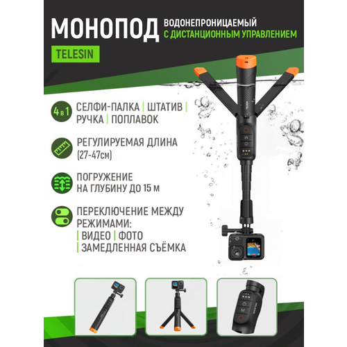 Компактный и прочный монопод TELESIN, созданный для пользователей GoPro, снимающих на суше и под водой. Водонепроницаемый (IP68, до 15 м), с 5-секционным удлинителем до 47 см и Bluetooth пультом ДУ. Идеален для водных видов спорта и путешествий, обеспечивает стабильные кинематографичные кадры в бассейнах, морях и в дороге.