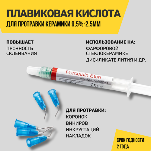 Простота использования: плавиковая кислота поставляется в удобном пластиковом шприце объемом 2,5 мл, который легко использовать и хранить.