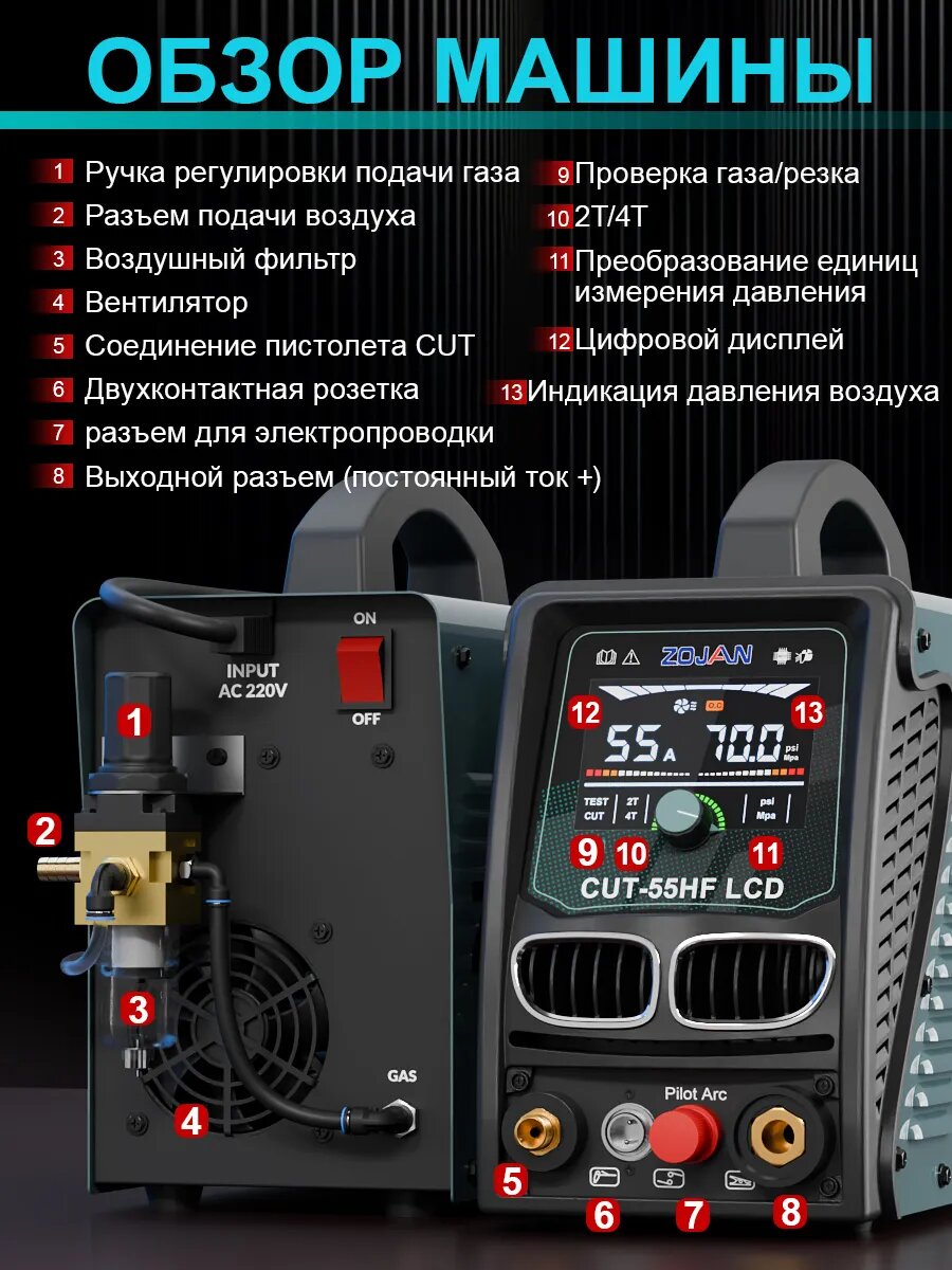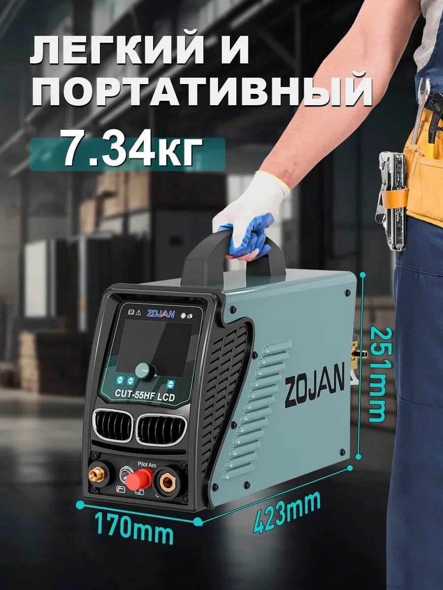 【Плазменный резак без прикосновения пилотной дуги】: плазморез по металлу ZOJAN CUT-55 HFLCD имеет высокочастотный процесс резки без касания пилотной дуги, головке резака не нужно касаться металлической пластины. Добавлена функция регулировки PA, увеличено время поддержания пилотной дуги, уменьшено потребление энергии при работе без резки, уменьшено горение электрода, увеличен срок службы. 【LCD дисплей】: Плазморез ZOJAN CUT-55 HFLCD оснащен новым ЖК-дисплеем большого размера, обеспечивающим более четкое поле интерфейса. На экране централизованно отображаются такие параметры, как давление воздуха, напряжение и ток. Пользователи могут контролировать состояние устройства в режиме реального времени, своевременно корректировать операции и повышать эффективность работы, не снимая шлема. 【 Передовые технологии 】: Принятие передовой технологии IGBT инвертора, высокочастотная пилотная дуговая плазма, регулировка тока 15A-55A, высокая скорость резки, гладкий участок резки и отсутствие требований к полировке. Максимальная толщина резки составляет 21 мм, идеальная толщина чистой резки составляет 12 мм. Он может нормально резать при температуре минус 20 градусов. 【Гарантия безопасности】: ZOJAN 55 Amp Машинка для стрижки с функцией автоматического дренажа, защищает электрод и сопло. Функция 2T/4T/TEST проста в эксплуатации. 2T - это полуавтоматическое управление резкой, а 4T - автоматическое управление резкой. Этот резак с функциями защиты от перегрева и перегрузки по току, с отличным и надежным качеством, использовать больше безопасности.