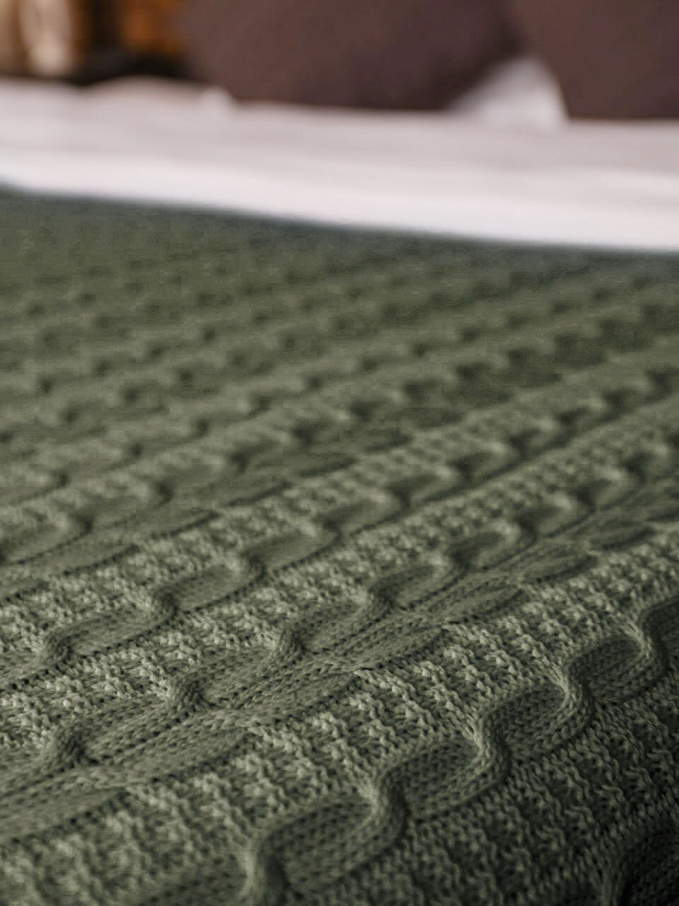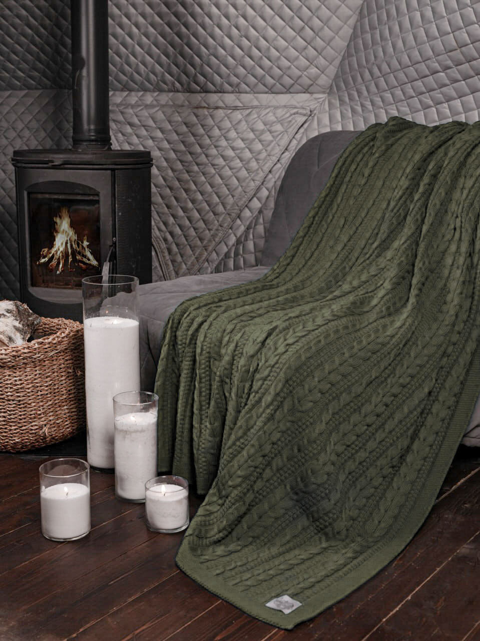 Купить Плед 180х220, вязаный, Warm Whiff, хаки, хлопок, покрывало на кровать, на диван, на кресло, в подарочной коробке с доставкой по всей России.