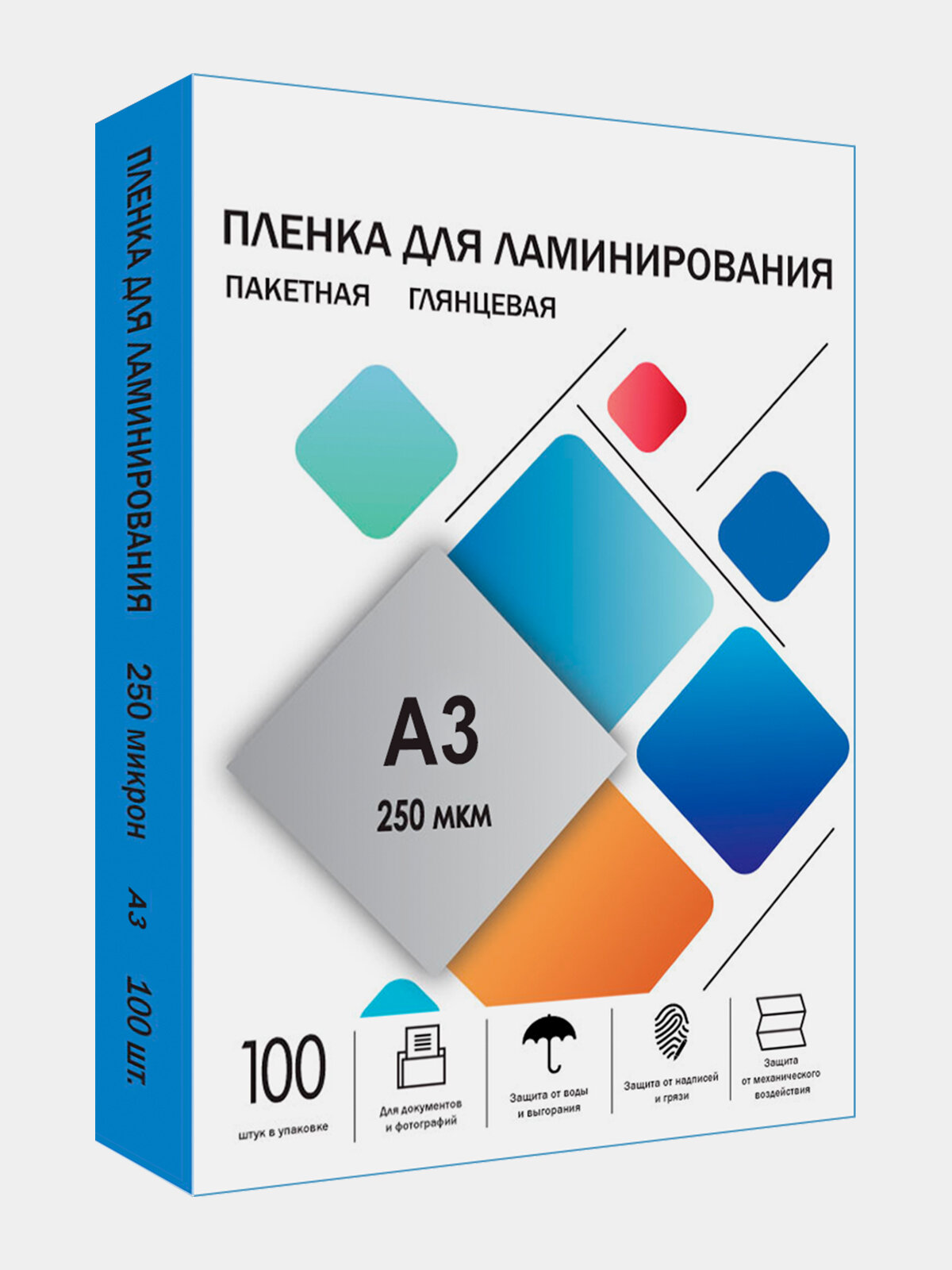 Пакетная глянцевая пленка для горячего ламинирования. Формат А3 плотностью 250 мкм. В упаковке 100 штук.