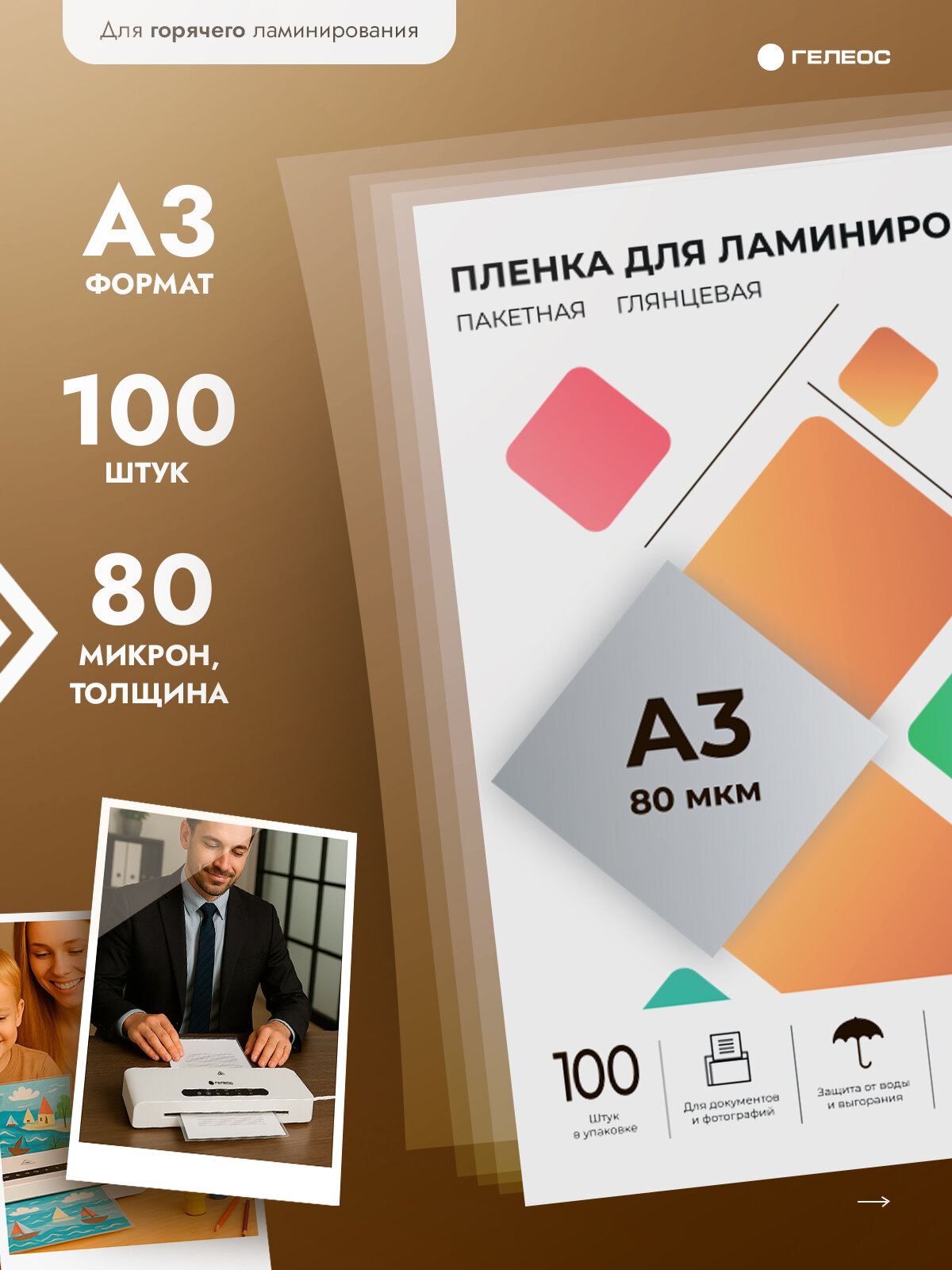 Купить Пленка для ламинирования ГЕЛЕОС, А3, 80 мкм, 100 штук, глянцевая с доставкой по всей России. Пленка для ламинирования ГЕЛЕОС, А3, 80 мкм, 100 штук, глянцевая: сравнение цен, характеристики, фото, актуальное наличие и цены.