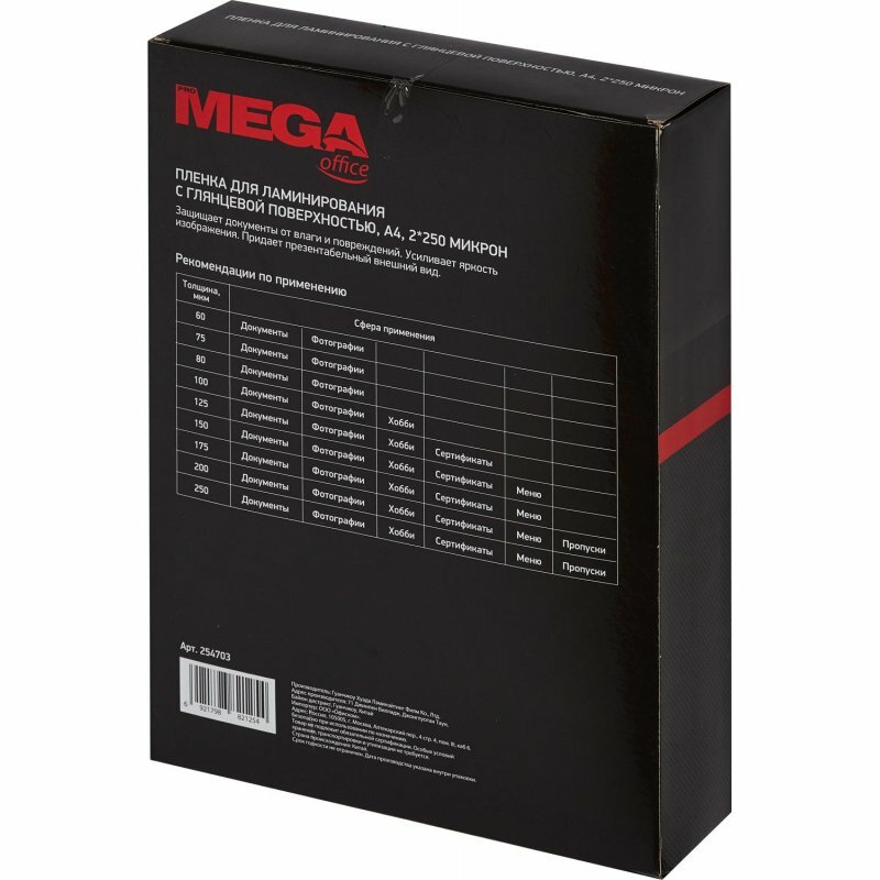 Пленка для ламинирования ProMega office предназначена для защиты документов от механических повреждений и влаги, продлевают срок службы документов и придают им наиболее презентабельный вид. Все заготовки для ламинирования ProMega office имеют прозрачность 99% и обладают антибликовыми свойствами. Широкий спектр размеров заготовок ProMega office позволит вам заламинировать любые документы до А3 формата включительно. Рекомендации по эффективному ламинированию: 1) Убедитесь, что температура ламинатора соответствует микронности пленки. Чем больше толщина пленки, тем выше должна быть выставленная на ламинаторе температура или микронность. Если ламинатор перегрет (на готовом образце появились волны или пузыри), то ламинатору необходимо дать остыть, иначе пленка будет плавиться. Если ламинатор холодный, то при ламинировании на пленке могут образоваться незаламинированные места или пузыри. 2) Если при ламиниров