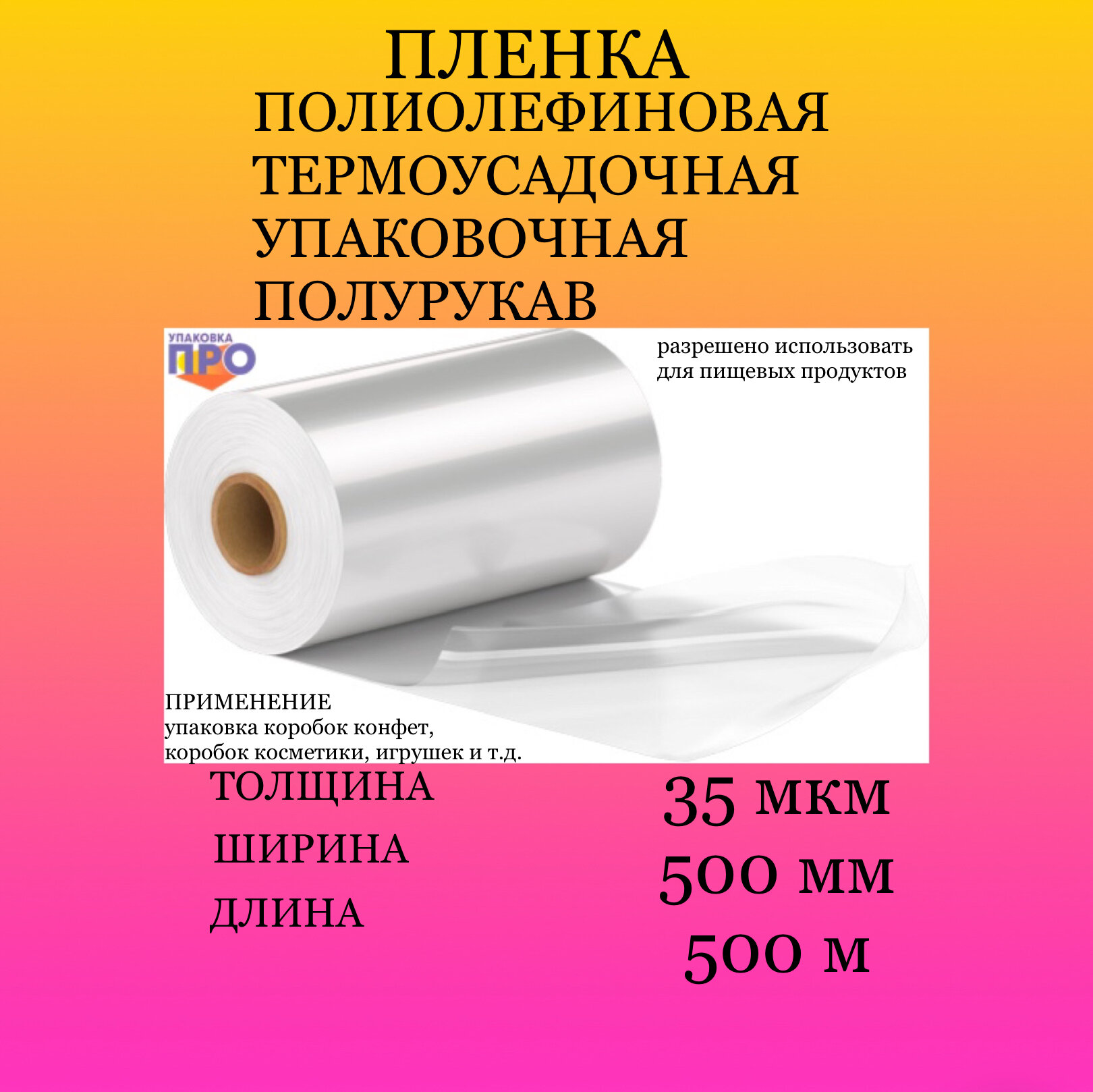 Пленка поф термоусадочная полурукав легка в применении, достаточно просто поместить продукт в пленку поф, нагреть упаковку и готово! Пленка плотно обтянет товар, сохраняя при этом свою прозрачность. Особой популярностью такой материал пользуется у пищевых производств, строителей, кондитеров, изготовителей мыла. Товар, упакованный в полиолефиновую пленку, можно полностью видеть, но при этом уже имеется отличный товарный вид.
