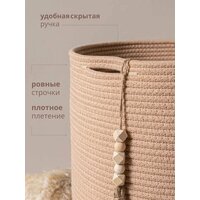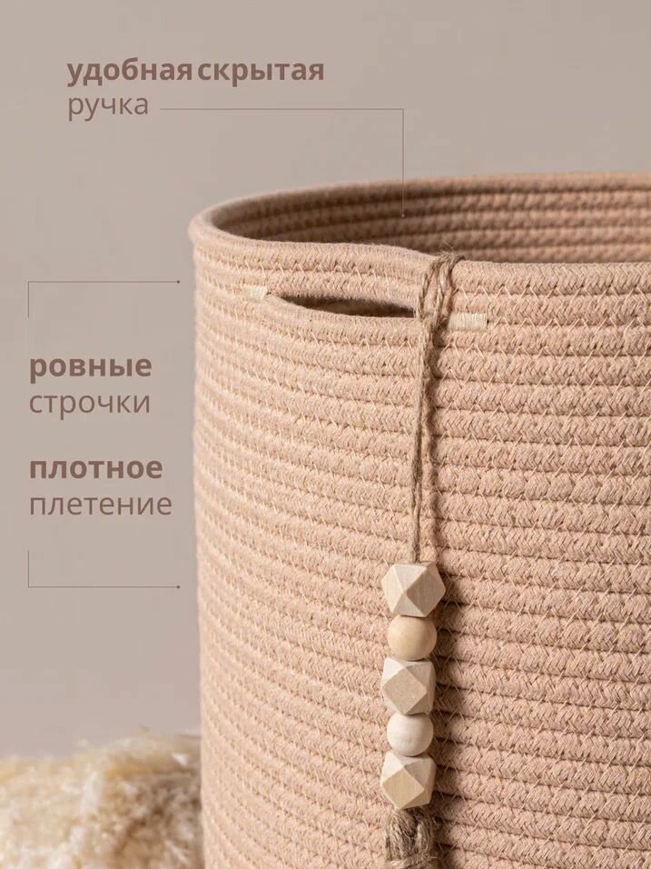 Плетеная корзина – это идеальный контейнер для организации пространства в вашем доме. Эта удобная и вместительная высокая корзина выполнена из экологически чистых материалов, таких как хлопковый шнур и джут, что делает её функциональной и безопасной для использования. Благодаря круглой форме, она легко вписывается в любой интерьер, будь то ванна или гардероб.