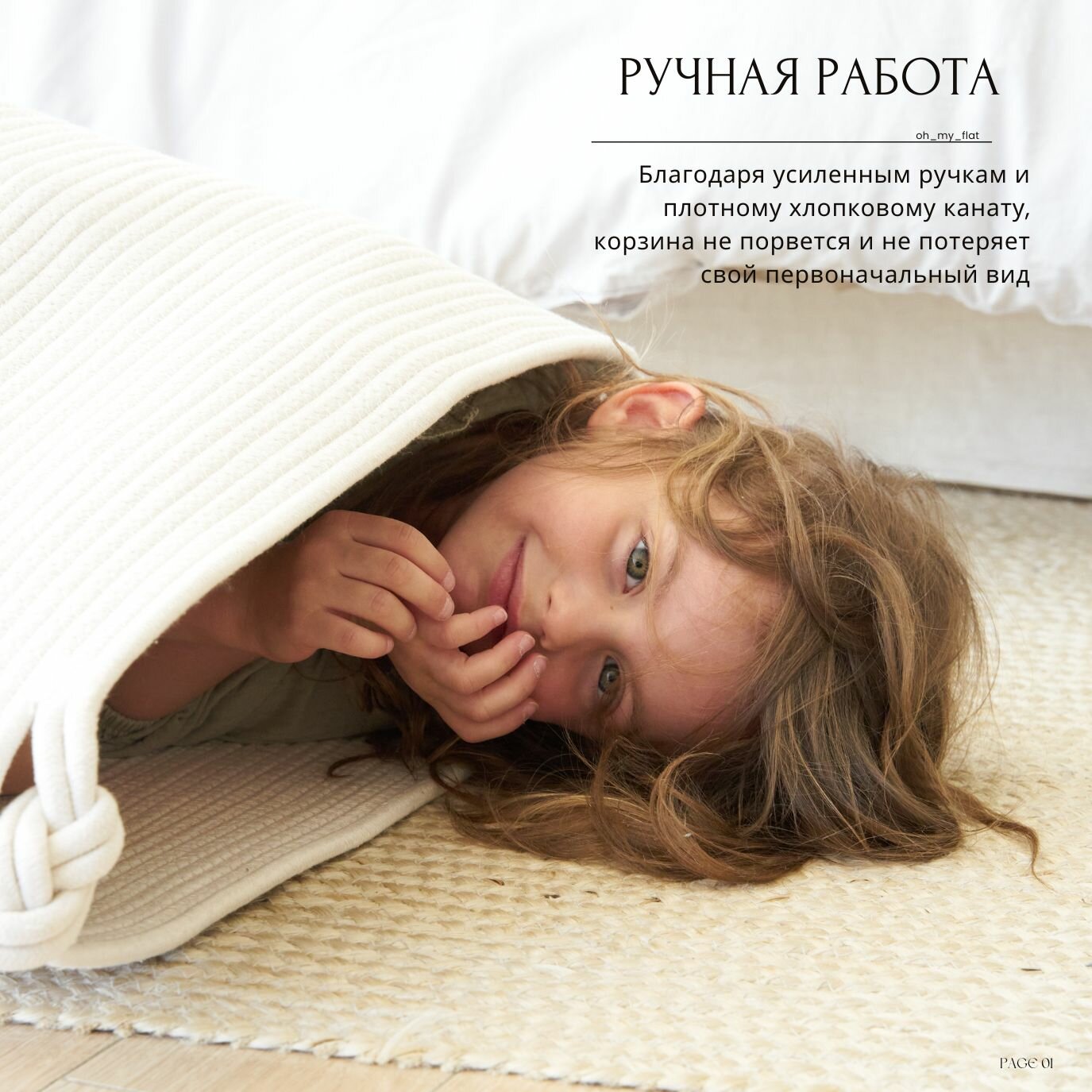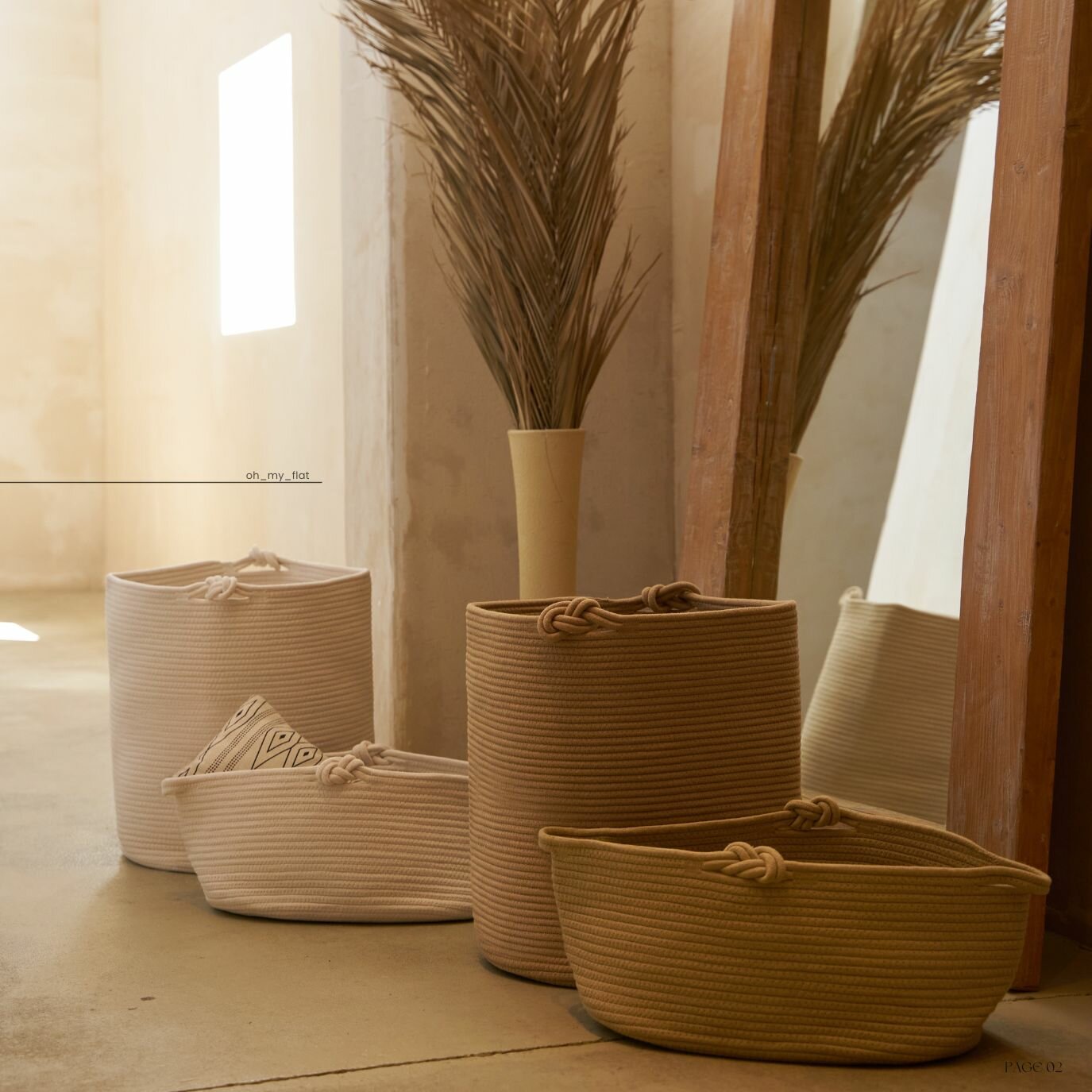 Большая белая корзина для хранения вещей OH MY FLAT выполнена из 100% хлопка, натурального текстильного волокна, изготавливаемого из растений. В отличии от корзин из грубого джута (джутовой веревки) , в ней можно хранить даже деликатные вещи.