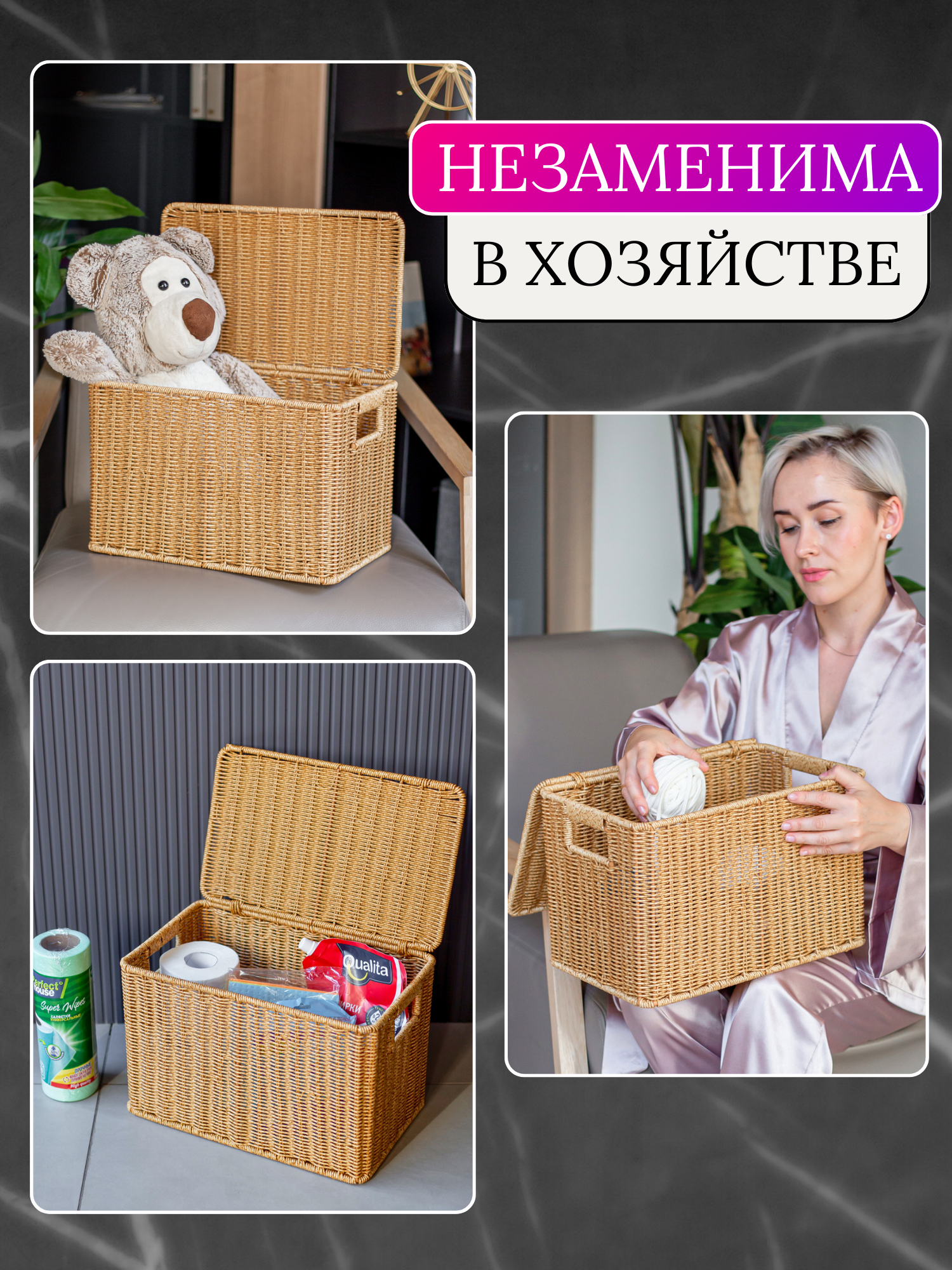 Приятная на ощупь текстура, вместительность и безопасный вид плетения подходит для детской комнаты как короб для хранения или корзина для игрушек небольшого размера, для хранения канцелярии или на стол рукодельнице. Плетеная корзина новогодняя в спальне или гостиной станет местом для хранения белья, книг и мелочей. В ванной комнате как корзина для хранения косметики и аксессуаров. На кухне плетеная корзина с крышкой и ручками станет местом для специй, хлеба, овощей, приборов, посуды, моющих средств. Корзина отлично встанет в гардеробную или шкаф, подойдёт для стеллажей Икеа (ikea) И Леруа Мерлен.