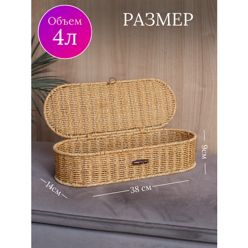 Плетеная корзина для хранения размер: 38х14х9см. Корзина плетеная с крышкой - это удобный и практичный предмет для хранения вещей. Корзина может быть одновремеено самостоятельным подарком, а может стать упаковкой для небольшого подарка. Плетеная корзина с крышкой или шкатулка - отличный выбор для тех, кто ценит комфорт и удобство в использовании. Она украсит любое помещение в вашем доме и квартире, станет незаменимым помощником в хранении вещей и организации порядка в спальне, гостиной, детской, прихожей. Особой популярностью плетеные корзины Jimmy`s Dome пользуются на кухне, прихожей, в ванной комнате и на балконе. В отличии от натурального ротанга, наши изделия, сделанные из полиротанга (пластиковая лента), не рассыхаются от перепада температур, не портятся от влаги и не подвержены поражению грибком и другой микрофлорой. Приятная на ощупь текстура, вместительность и безопасный вид. Плетеная шкатулка подходит для детской комнаты как короб для хранения канцелярии и мелочей, как корзина для игрушек небольшого размера, для хранения на стол рукодельнице. Такая корзина в спальне или гостиной станет местом для хранения аксессуаров и мелочей. В ванной комнате как корзина для хранения косметики. На кухне плетеная корзина с крышкой станет местом для специй, конфет, приборов. Корзина для хранения с крышкой это прекрасный самостоятельный подарок, который обязательно порадует любого, кто ценит порядок и экологичность материалов. Также её можно наполнить косметикой или другими приятными мелочами и получить уже готовый подарочный набор. Эта корзина подарочная так же может использоваться для фотосессии, стать супер подарком на новоселье или день рождения мамы сестрыподруги бабушки коллеге.