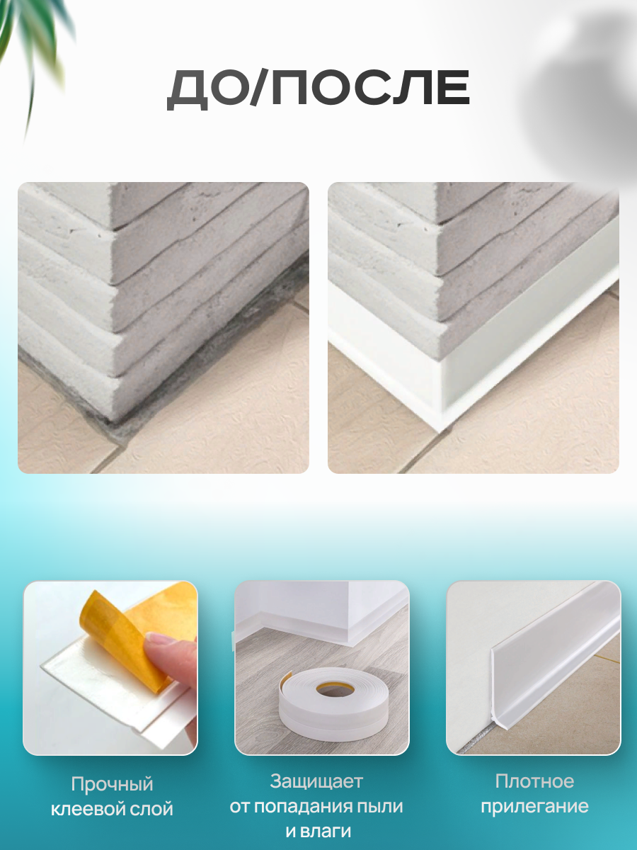 Эластичный материал гибкого плинтуса обеспечивает плотный монтаж к стенам с изгибами и к колоннам, там, где монтаж объемного плинтуса нецелесообразен или не возможен. Конструкция гибкого плинтуса минимально выступает от стены и напольного покрытия. Гибкий плинтус напольный имеет нанесенный клеевой слой закрытый защитным лайнером.