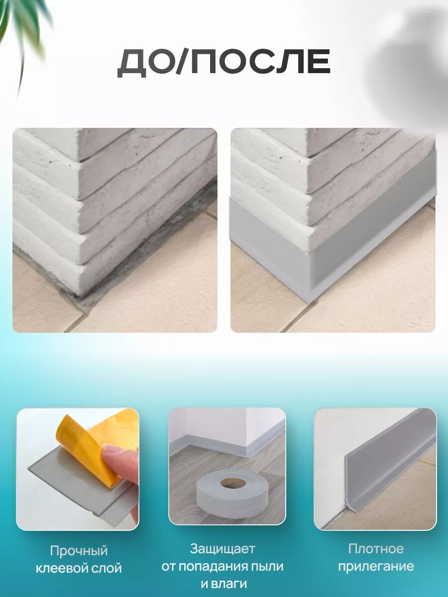 Эластичный материал гибкого плинтуса обеспечивает плотный монтаж к стенам с изгибами и к колоннам, там, где монтаж объемного плинтуса нецелесообразен или не возможен. Конструкция гибкого плинтуса минимально выступает от стены и напольного покрытия. Гибкий плинтус напольный имеет нанесенный клеевой слой закрытый защитным лайнером.