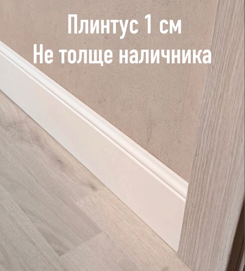 Самое главное преимущество этого плинтуса заключается в том, что он имеет толщину всего 1 сантиметр, что позволяет ему выглядеть очень аккуратно и эстетично, не торчит из-за наличника в отличии от 90% плинтусов стандартной толщины в 16 мм. Он также легко режется под углом 45 градусов, что упрощает процесс монтажа