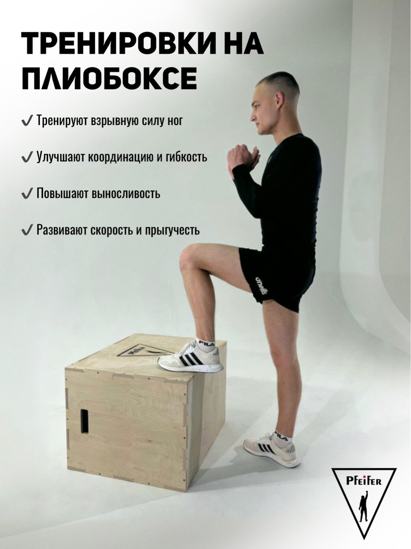 Помимо прыжков плиобокс можно использовать для отжиманий, приседаний, выпадов, планки и других упражнений. — Прыжки на плиометрическую тумбу прежде всего работают на развитие взрывной силы ног.
