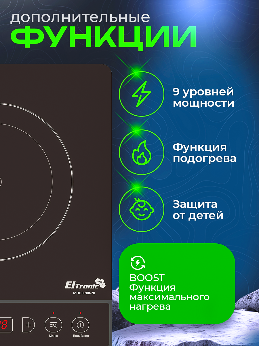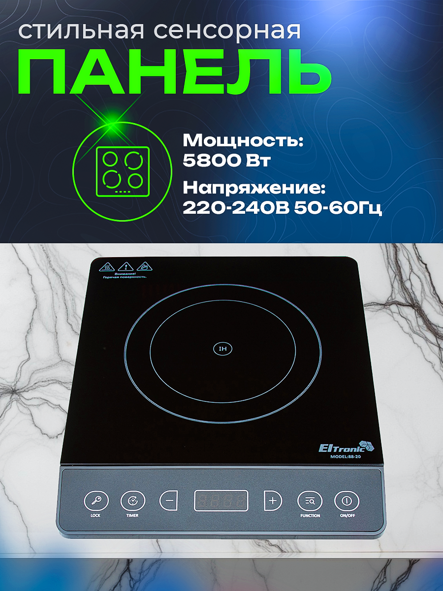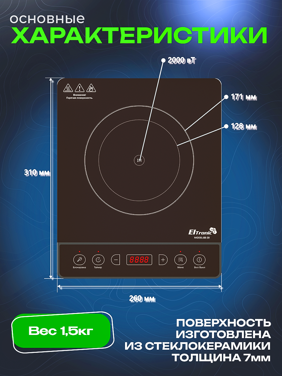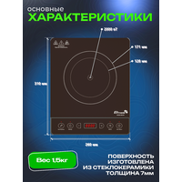 | Дополнительная информация | два размер конфорки, 171мм и 128мм; размер плиты 26 х 7 х 31 см; таймер; защита от детей; функция подогрева |