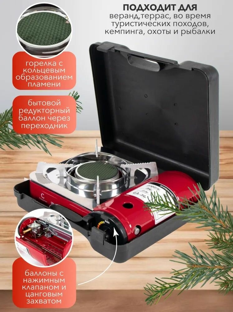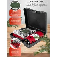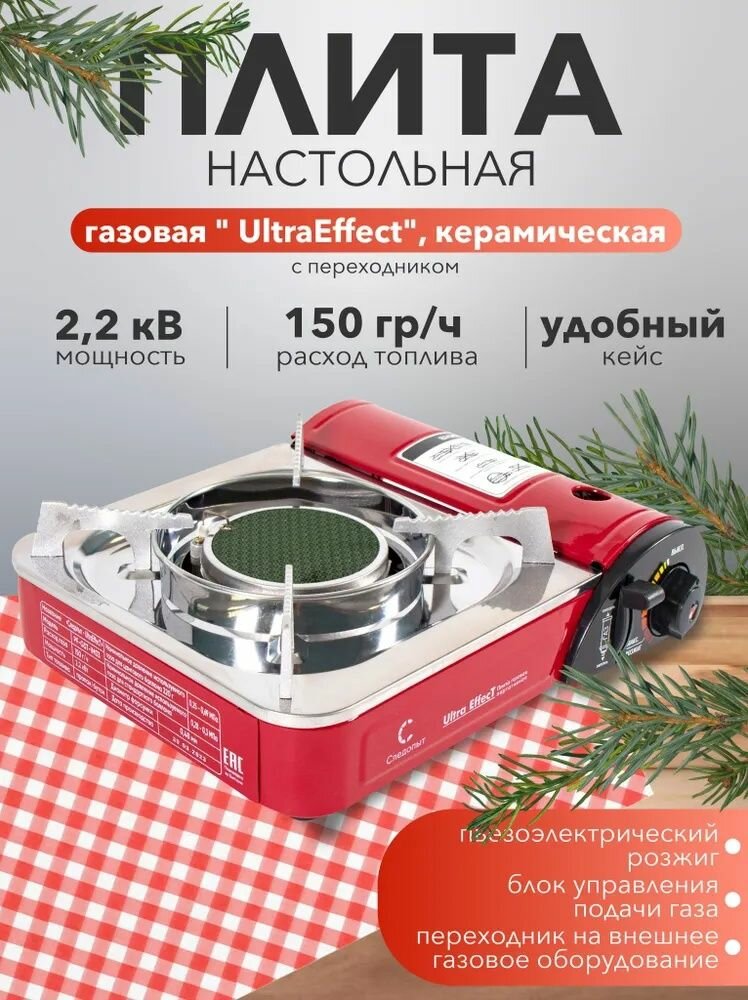 Плита настольная газовая «Следопыт Ultra effect» предназначена для приготовления пищи как в домашних условиях, так и открытом воздухе. Плита оборудована одной горелкой с керамическим покрытием, имеет пьезоэлектрический розжиг и блок управления подачи газа. Для удобства транспортировки и хранения плита размещается в пластиковом кейсе. В качестве топлива используются газовые смеси в баллонах с нажимным клапаном и цанговым захватом, а также бытовой редукторный баллон через переходник. Подходит для установки на открытых верандах, террасах и беседках. Может использоваться во время туристических походов, кемпинга, охоты и рыбалки.