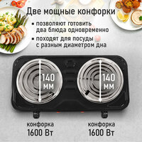 3200W, 2 конфорки d=14см, нагревательный элемент из нерж. стали, световой индикатор работы. 2-х конфорочная электрическая плитка с диаметром конфорки 14 см и нагревательным элементом из нержавеющей стали. Отличное решение для быстрого приготовления пищи при отсутствии стационарной плиты. Нагревательный элемент из нержавеющей стали обладает отличной теплопроводностью, имеет длительный срок службы, не боится влаги и легко чистится. Компактная электрическая плитка – это отличное решение для дачи или квартиры, где еще не закончен ремонт. Компактная настольная электроплитка поместится на любой кухне, не настольная индукционная плита - это приобретение по бюджетной цене. Бытовая техника для кухни, электроплитка - товары для дома, плитка мечта любой хозяйки. Девайсы для кухни – плитка настольная – необычайно полезный прибор, для вкусного и здорового питания. Плитка электрическая для дачи, настольная плитка удобный гаджет для приготовления вкусной и здоровой пищи, для похудения. Техника для кухни бытовая техника! Приготовление блюд с использованием кухонная техника сделает ваши рецепты вкусными и полезными!