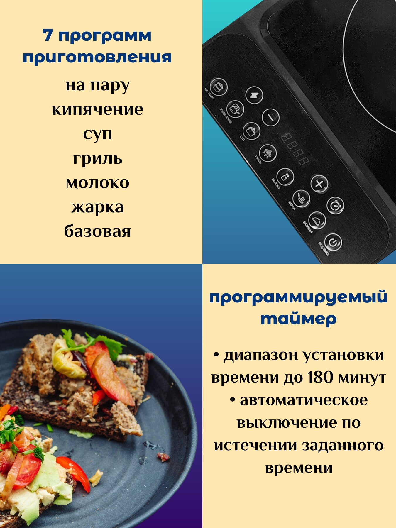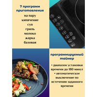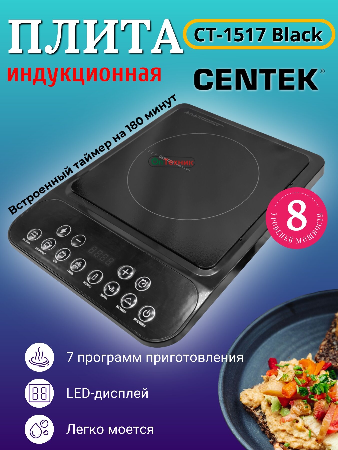 Индукционная плита, одна конфорочная, CENTEK, CT-1517, черная, мощность 2000 W (Вт), 8 настроек мощности, 7 программ, таймер, LED дисплей