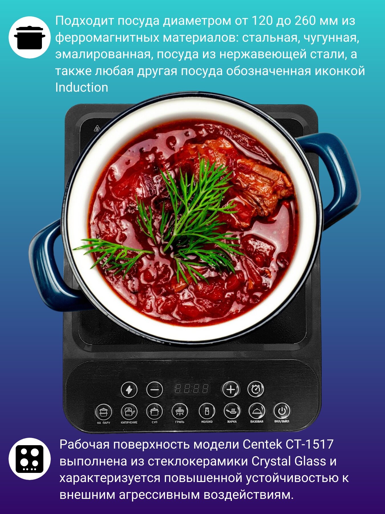Помимо функциональности и прочности, индукционная плита Centek CT-1517 также является энергоэффективным решением. Индукционная технология позволяет сократить время нагрева по сравнению с традиционными электрическими плитами, что сэкономит ваше время и электроэнергию.
